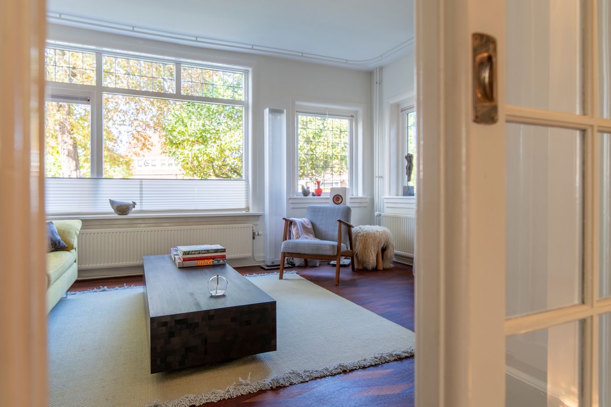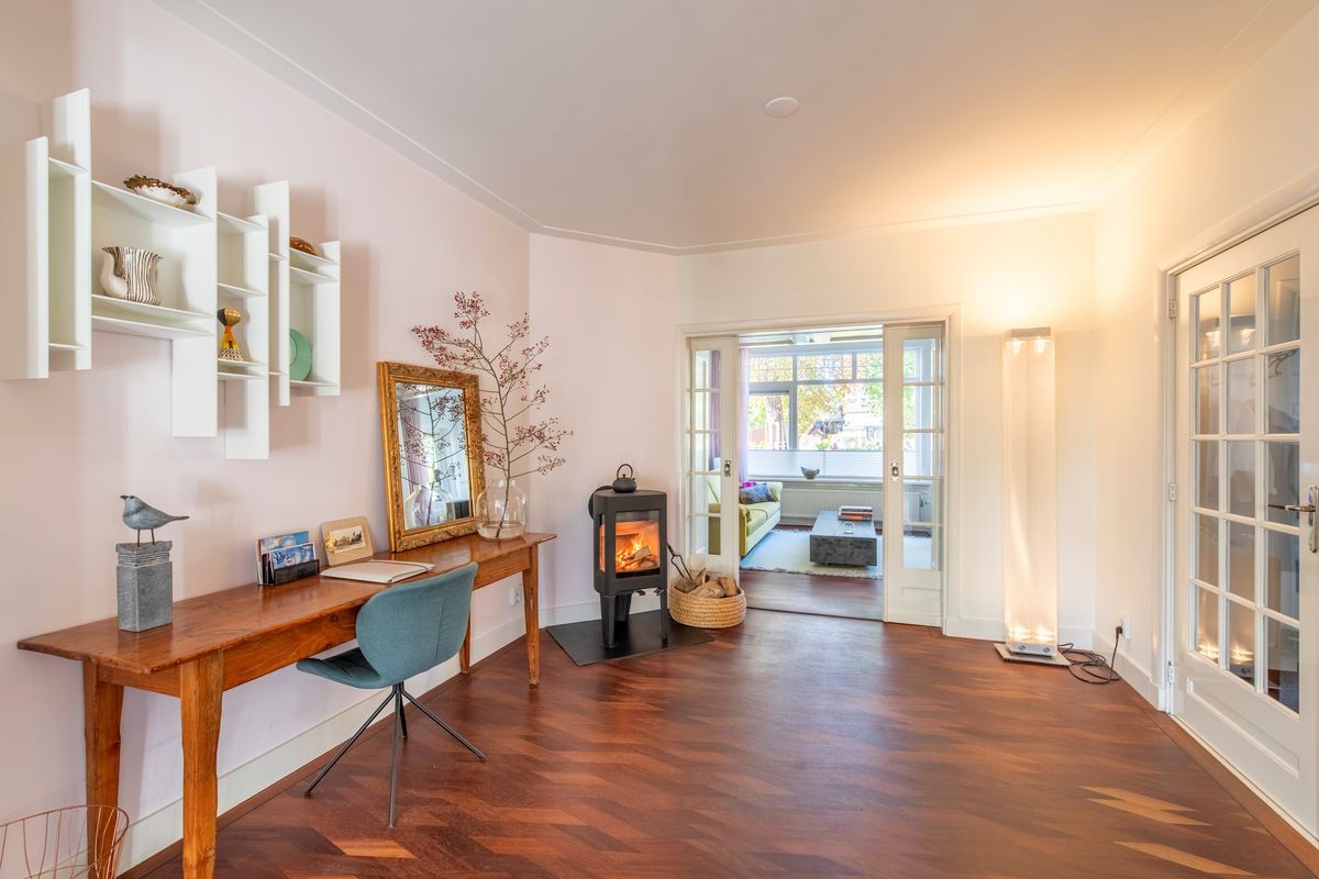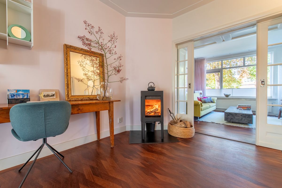 Begane grond: Na getrokken te hebben aan de authentieke trekbel, zwaait de voordeur voor u open. Een prachtige, originele granito vloer lacht u als jaren '30 liefhebber al toe. Maar dat is niet het enige. Want we zien ook een schitterende trap met een traploper van hoge kwaliteit. Tenslotte is er in de hal een trap-/kelderkast. Lopen we verder dan bekijken we de woonkamer. We benoemden het al, deze woonkamer heeft een kamer-en suite met originele schuifdeuren en een prachtige ombouw. De voorzijde is vanwege veel lichtinval heerlijk licht, ook geniet u hier een mooi zicht op de voortuin en de straat. Al dan niet door glas-in-lood. In de achterkamer is een fijne haard geplaatst. Wij verwachten daarom dat u hier tijdens een donkere, koude winteravond extra lang zult blijven zitten. Een schuifpui verbindt binnen op en natuurlijke manier met buiten. De half-open keuken heeft onder- en bovenkasten met fronten in een lichte kleur. Aan inbouwapparatuur is er een keramische kookplaat, een afzuigkap, een oven, een koelkast en een vaatwasser aanwezig. Ook is er een apothekerskast. Het portaal heeft deuren naar het toilet en naar buiten.