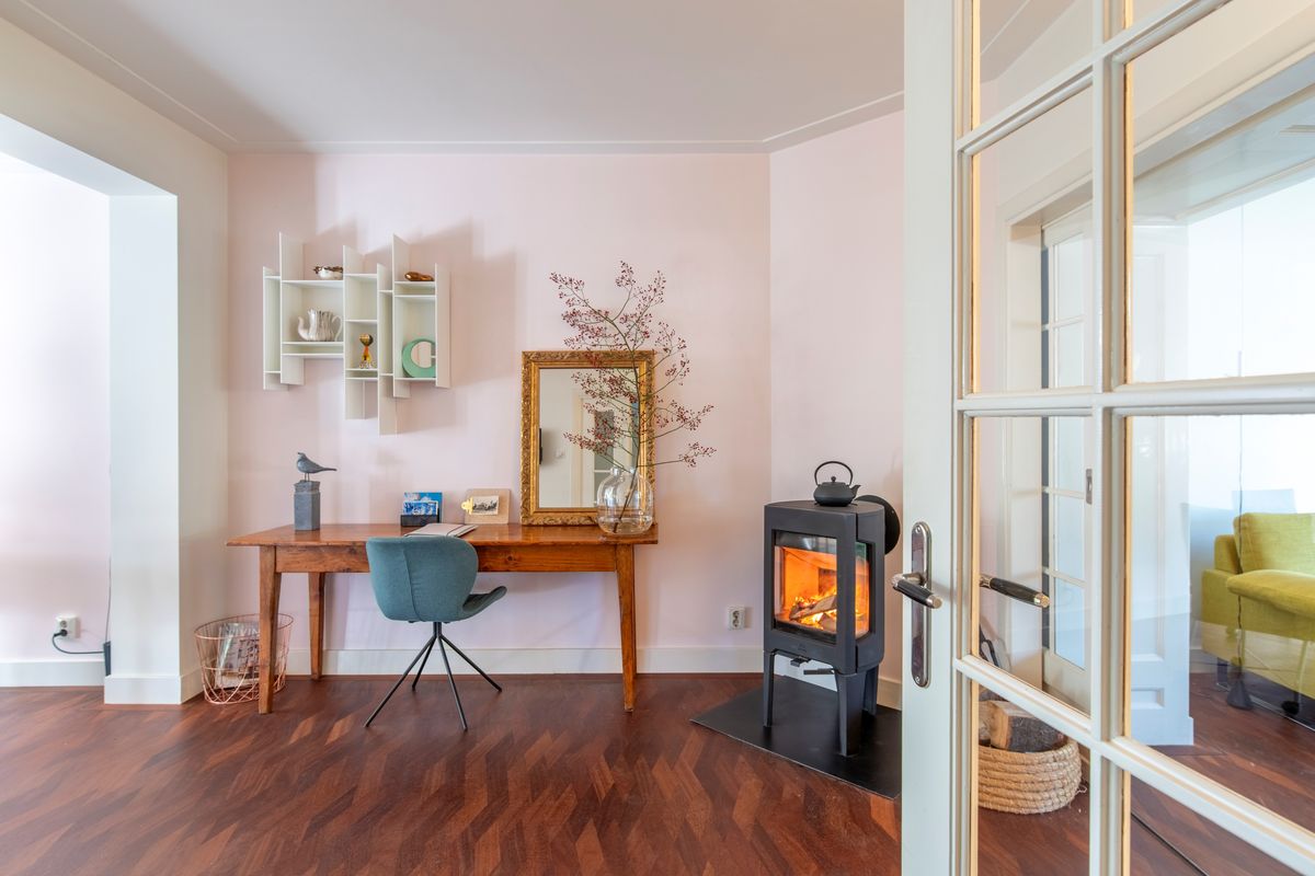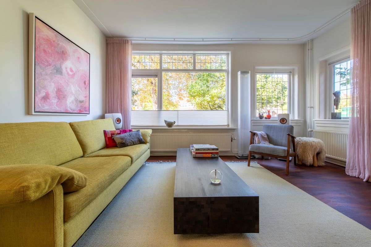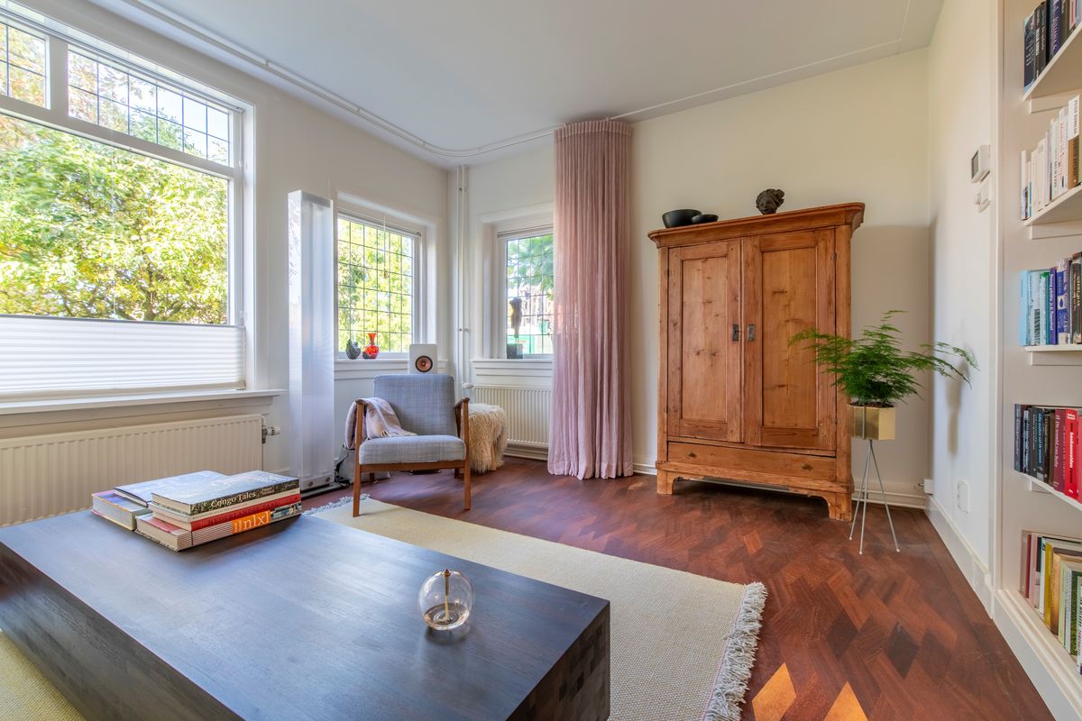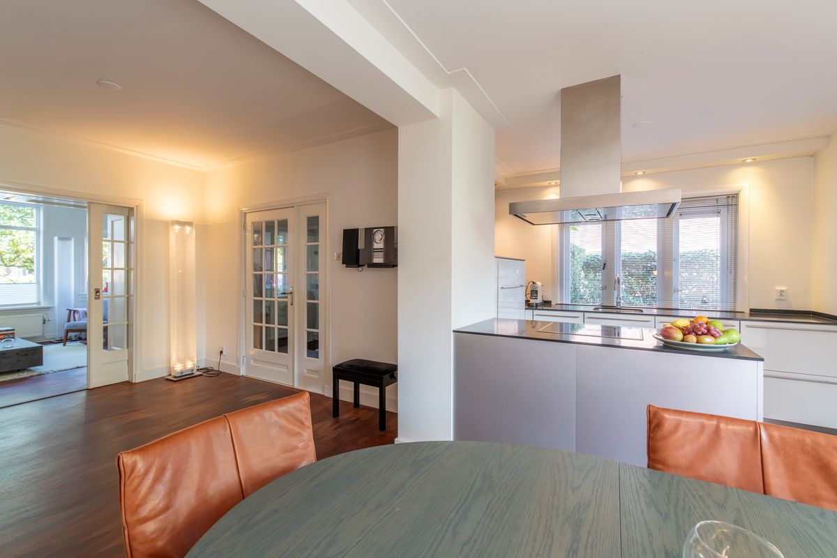 Begane grond: Na getrokken te hebben aan de authentieke trekbel, zwaait de voordeur voor u open. Een prachtige, originele granito vloer lacht u als jaren '30 liefhebber al toe. Maar dat is niet het enige. Want we zien ook een schitterende trap met een traploper van hoge kwaliteit. Tenslotte is er in de hal een trap-/kelderkast. Lopen we verder dan bekijken we de woonkamer. We benoemden het al, deze woonkamer heeft een kamer-en suite met originele schuifdeuren en een prachtige ombouw. De voorzijde is vanwege veel lichtinval heerlijk licht, ook geniet u hier een mooi zicht op de voortuin en de straat. Al dan niet door glas-in-lood. In de achterkamer is een fijne haard geplaatst. Wij verwachten daarom dat u hier tijdens een donkere, koude winteravond extra lang zult blijven zitten. Een schuifpui verbindt binnen op en natuurlijke manier met buiten. De half-open keuken heeft onder- en bovenkasten met fronten in een lichte kleur. Aan inbouwapparatuur is er een keramische kookplaat, een afzuigkap, een oven, een koelkast en een vaatwasser aanwezig. Ook is er een apothekerskast. Het portaal heeft deuren naar het toilet en naar buiten.