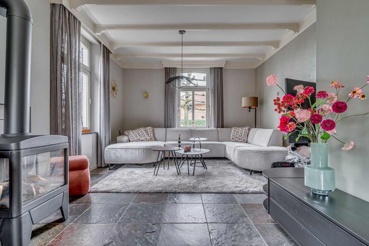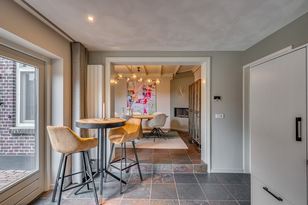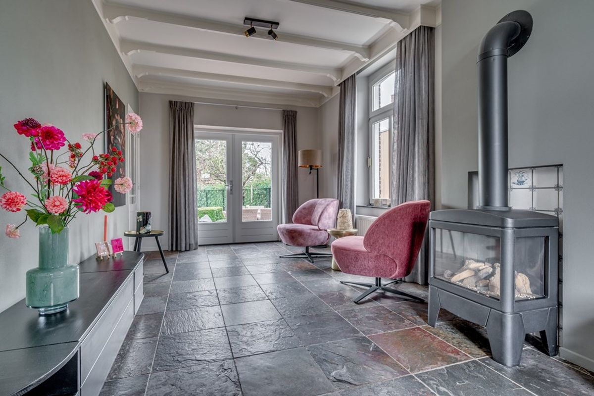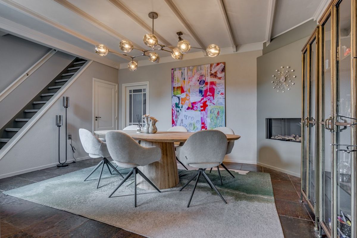 De sfeervolle woonkamer is voorzien van een leisteenvloer met vloerverwarming, een gezellige gashaard en openslaande deuren naar de tuin, waardoor binnen en buiten naadloos in elkaar overlopen. Aansluitend ligt de gezellige eetkamer, eveneens met vloerverwarming en gashaard: dé plek voor lange diners en goede gesprekken.