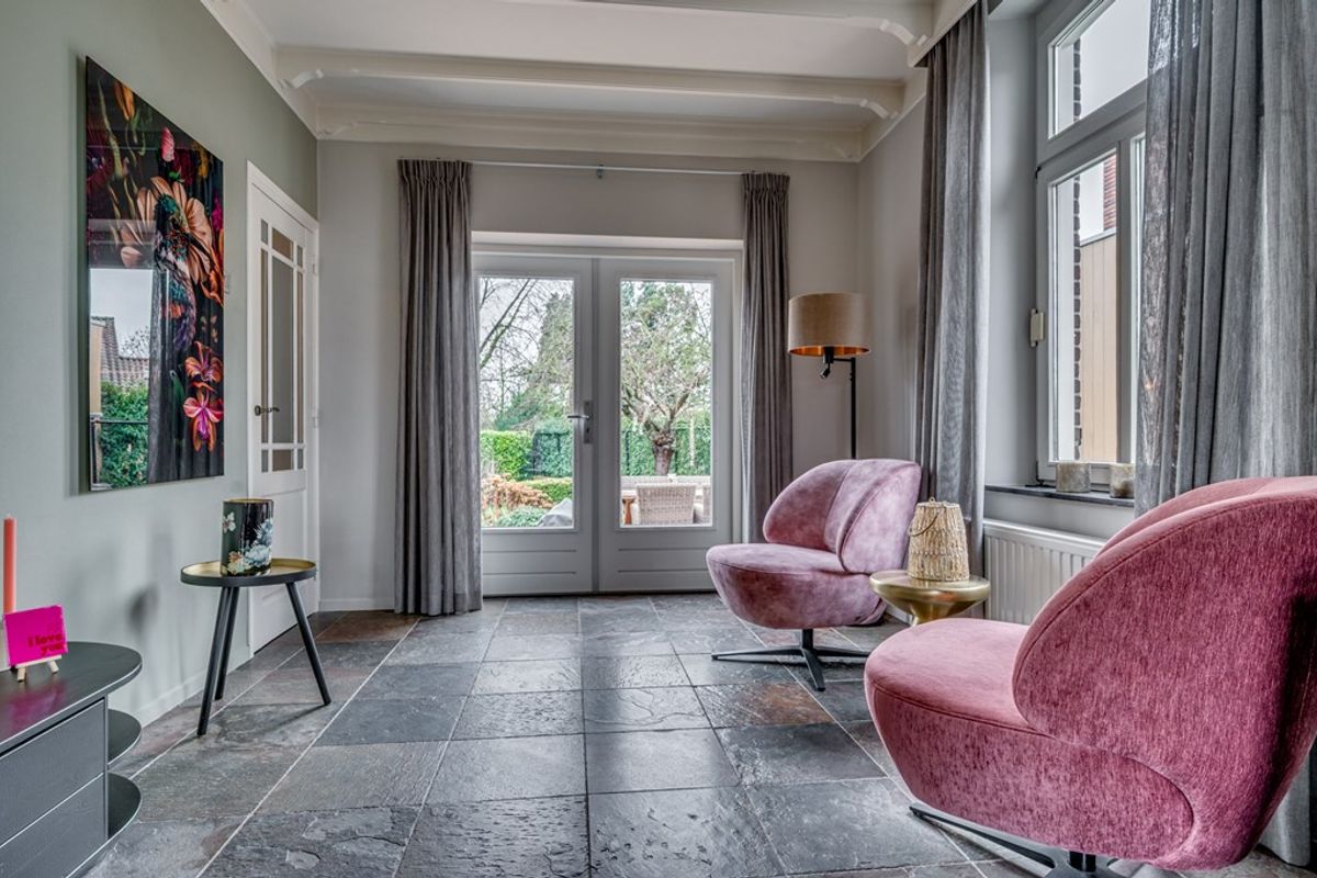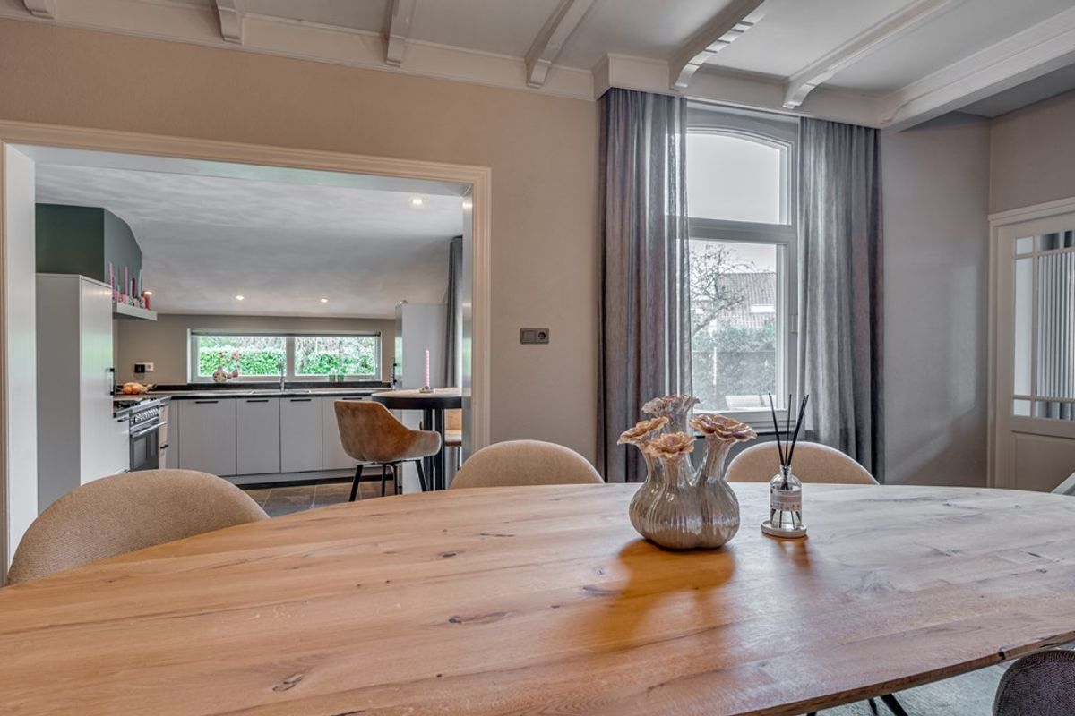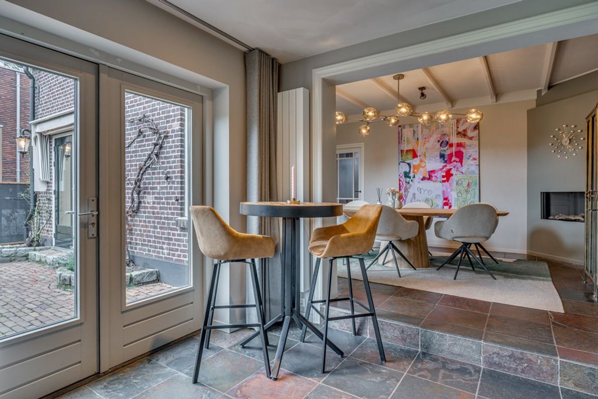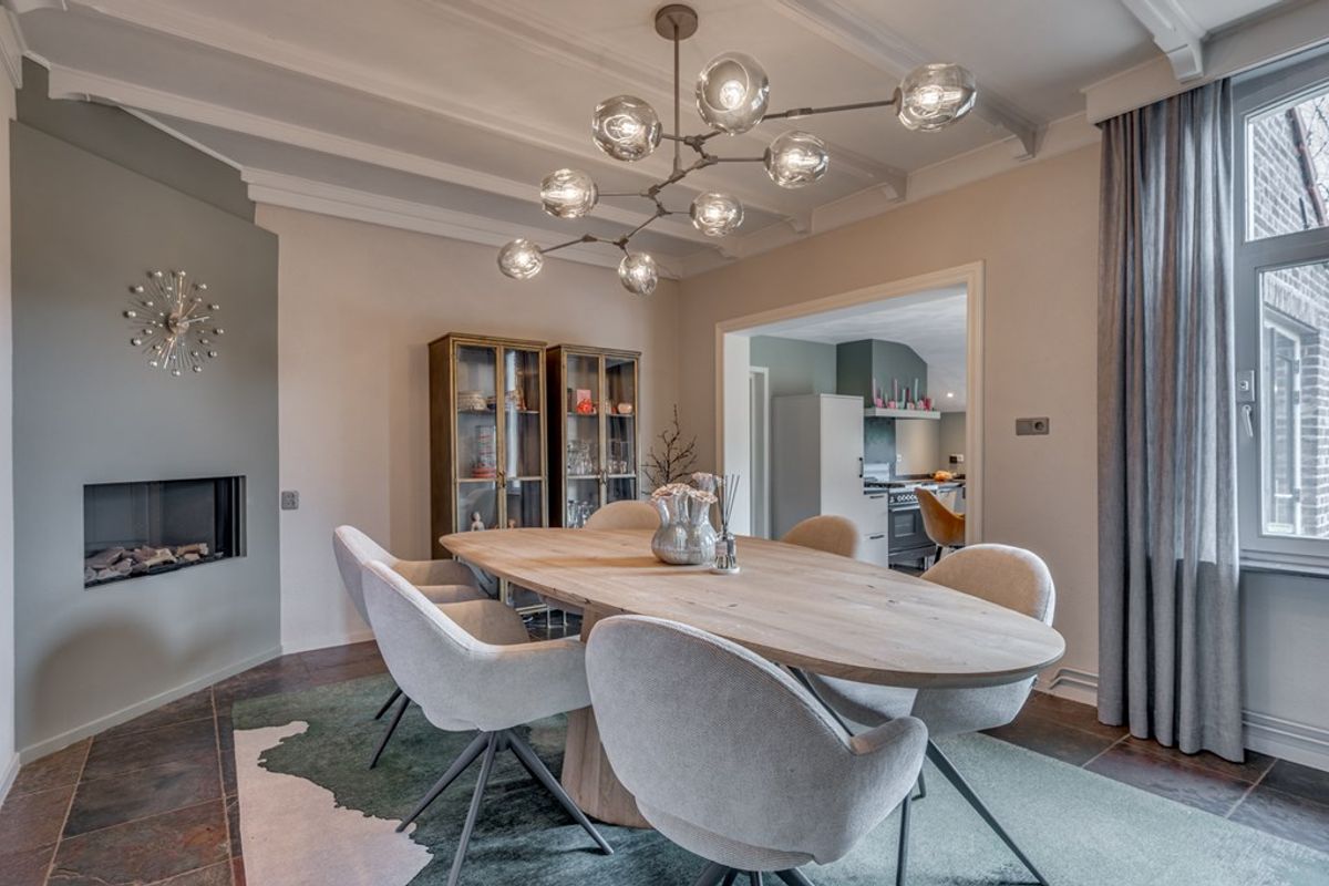 De sfeervolle woonkamer is voorzien van een leisteenvloer met vloerverwarming, een gezellige gashaard en openslaande deuren naar de tuin, waardoor binnen en buiten naadloos in elkaar overlopen. Aansluitend ligt de gezellige eetkamer, eveneens met vloerverwarming en gashaard: dé plek voor lange diners en goede gesprekken.