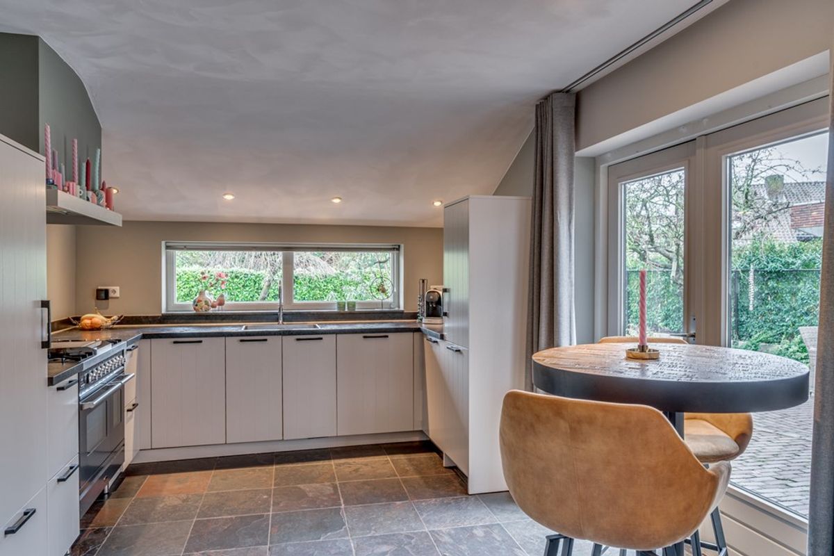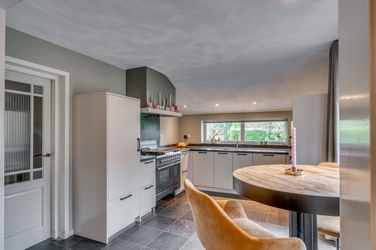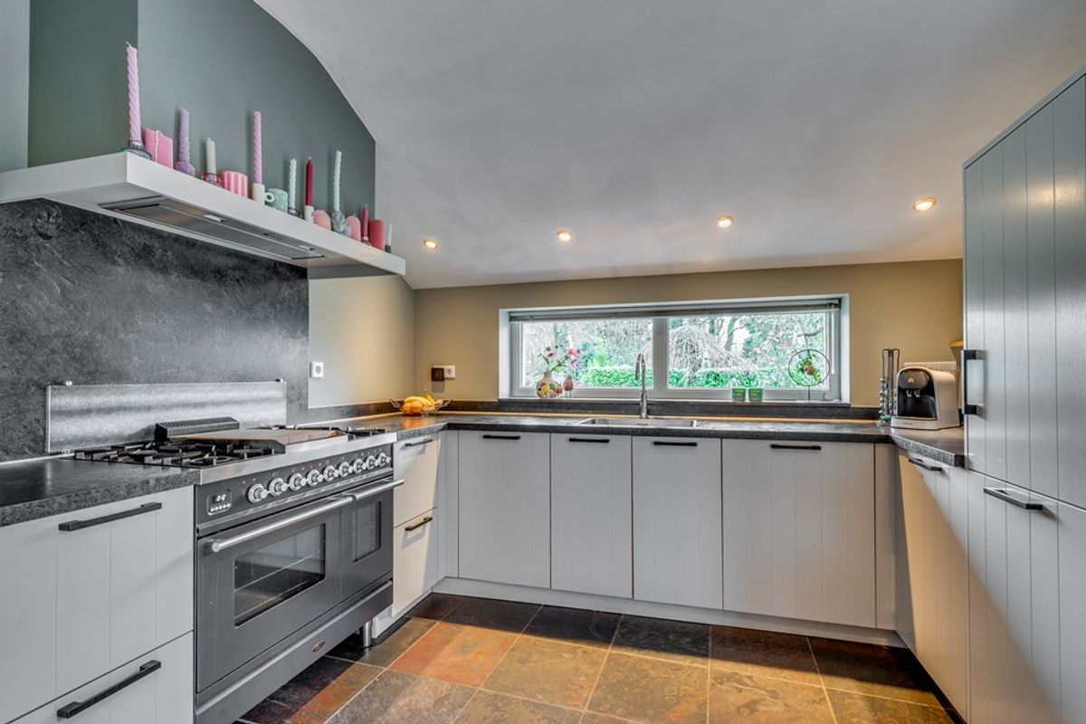 De open keuken (2019) is uitgevoerd met een leisteenvloer met vloerverwarming en uitgerust met hoogwaardige apparatuur, waaronder een Boretti 6-pits gasfornuis met dubbele oven, Quooker, koelkast en vaatwasser.