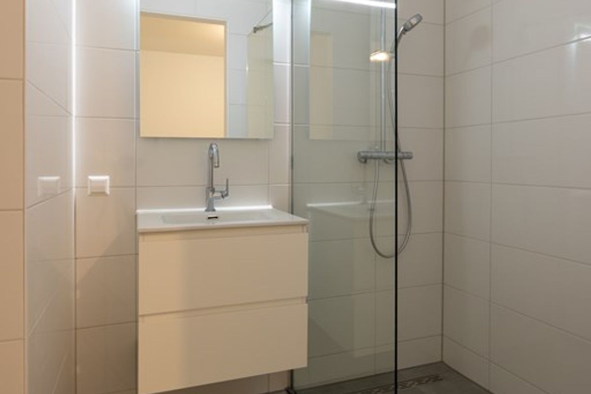 De badkamer is voorzien van een wastafel met wastafelmeubel en douche.