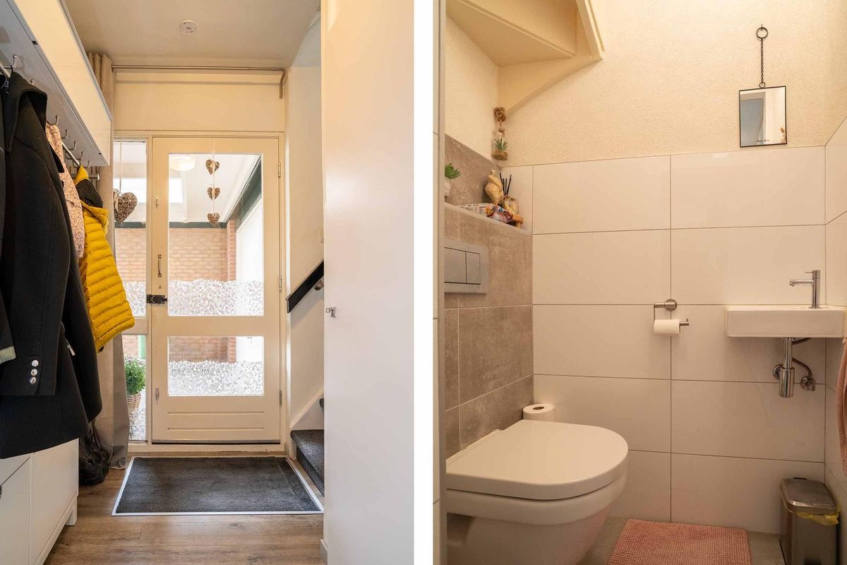 Begane grond: Entree, hal met toiletruimte voorzien van wandcloset en fontein, trapopgang en deur naar de woonkamer. De woonkamer is voorzien van een PVC-vloer. Vanuit de woonkamer heb je een prima uitzicht over het verkeersluwe plein. De L-vormige keuken in tijdloos wit beschikt over een composiet werkblad, inductiekookplaat, afzuigkap, vaatwasser, koelkast en combi-oven. In de achtergelegen bijkeuken vind je opbergruimte en alle aansluitingen voor wasapparatuur. Vanuit de bijkeuken heb je toegang tot de ruime garage en de tuin. De garage is riant te noemen en is voorzien van een electrische deur.