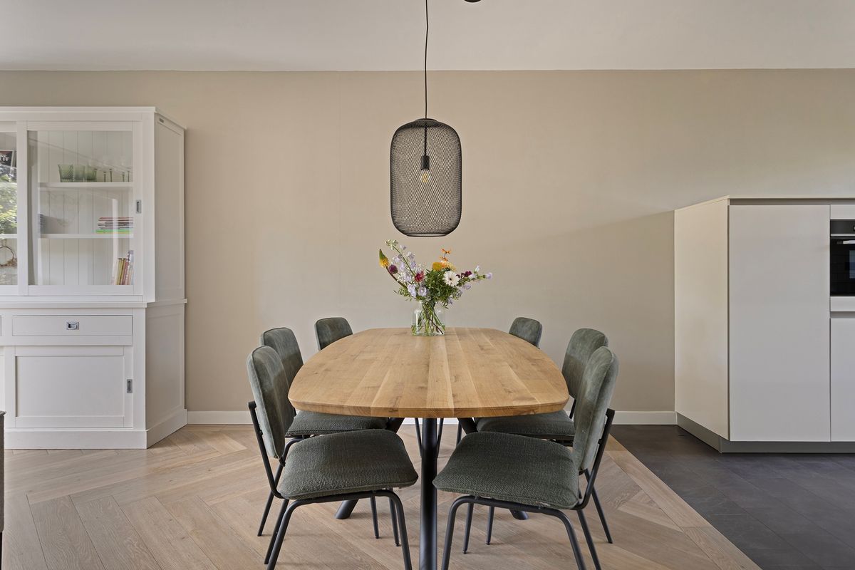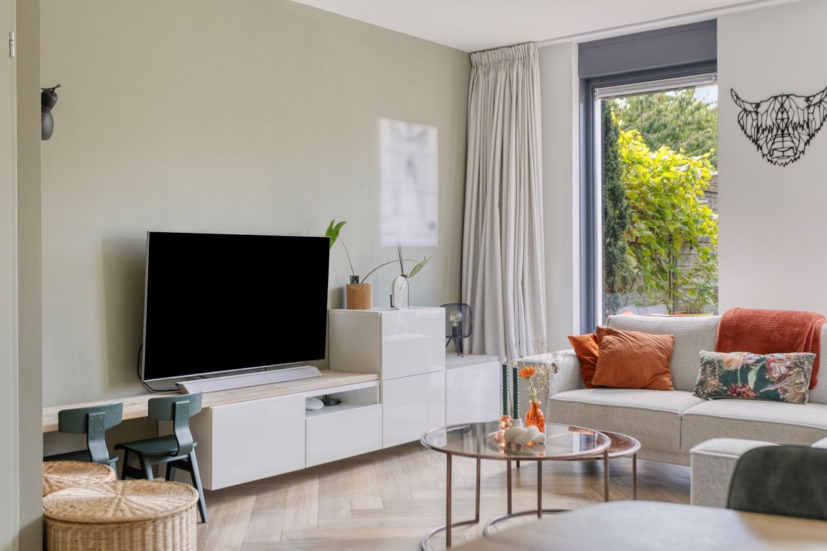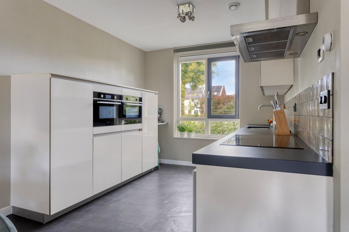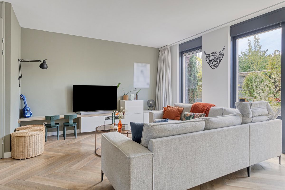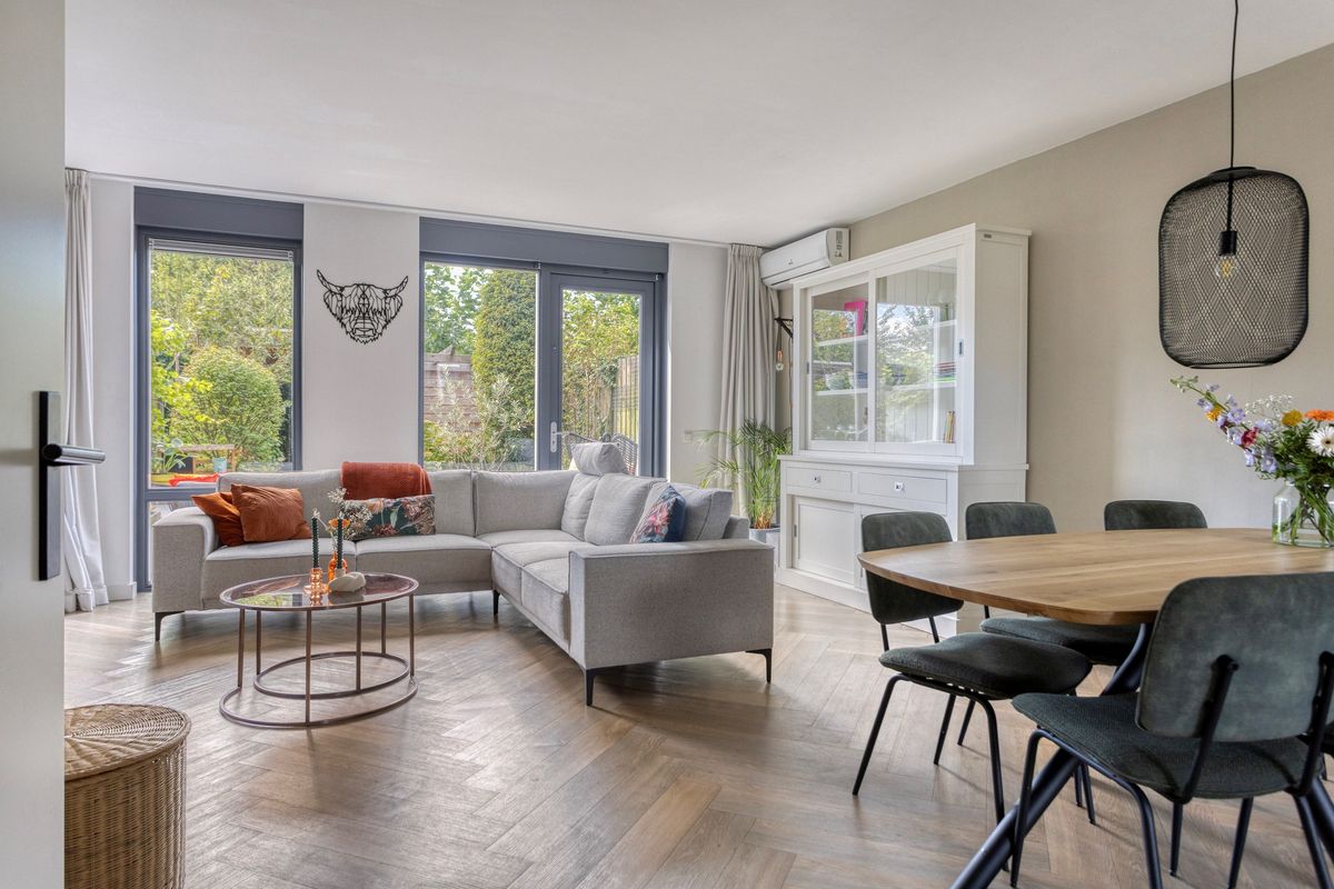 Via de entree met toilet en garderobe bereik je de lichte woonkamer met prettig zicht op de achtertuin. De open keuken aan de voorzijde is modern uitgevoerd en van alle gemakken voorzien. Denk aan een dubbele combi-oven, inductiekookplaat, vaatwasser, een kokend waterkraan én een aparte koelkast en vriezer. Vanuit de ruime woonkamer loop je zo verzorgde, privacyvolle tuin in gelegen op het zuidwesten.