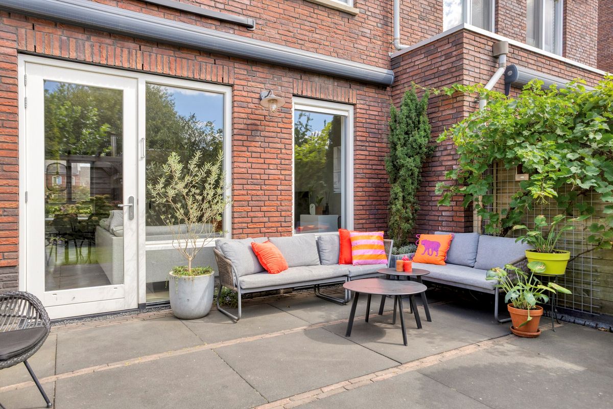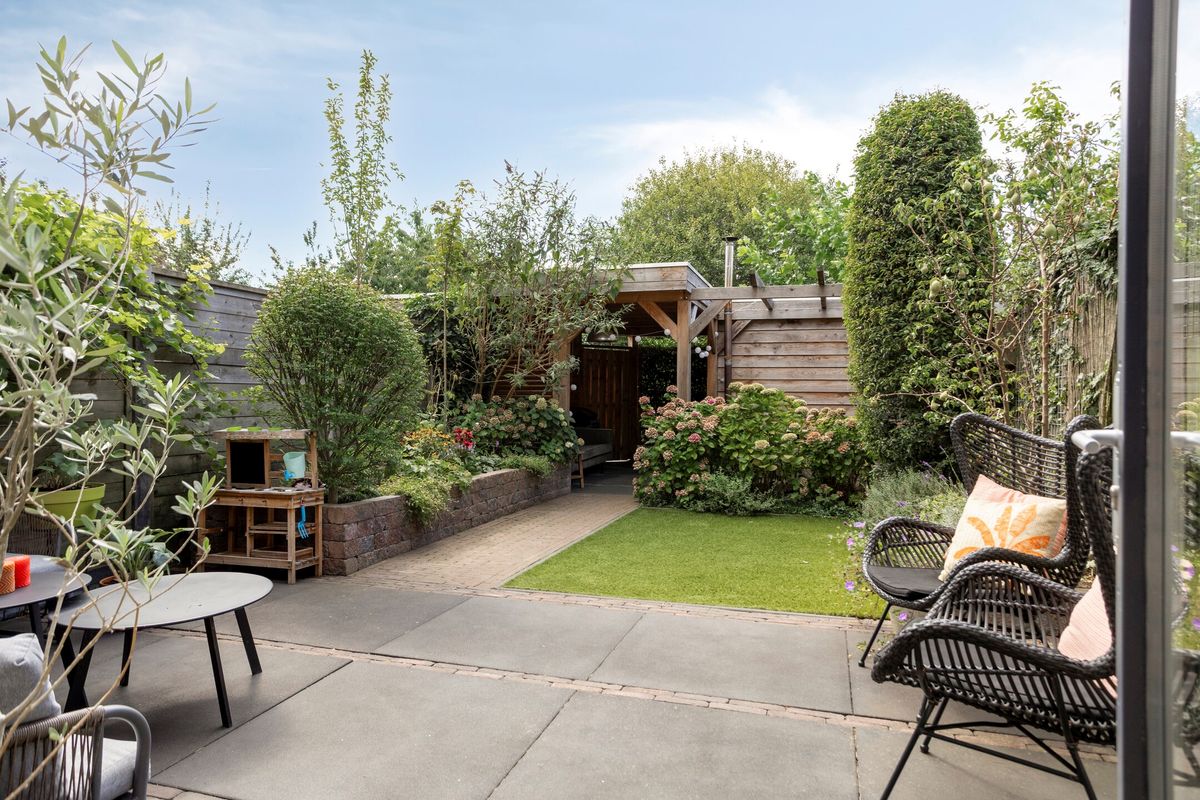 De zonnige achtertuin ligt op het zuidwesten en is keurig aangelegd. Doordat er geen directe achterburen zijn, geniet je hier van veel privacy en rust. Achterin de tuin bevindt zich een praktische berging voor fietsen en tuingereedschap met aangrenzend een sfeervolle en ruime overkapping. Met meerdere zitjes is dit een heerlijke plek om tot laat in de avond van de zon te genieten.
