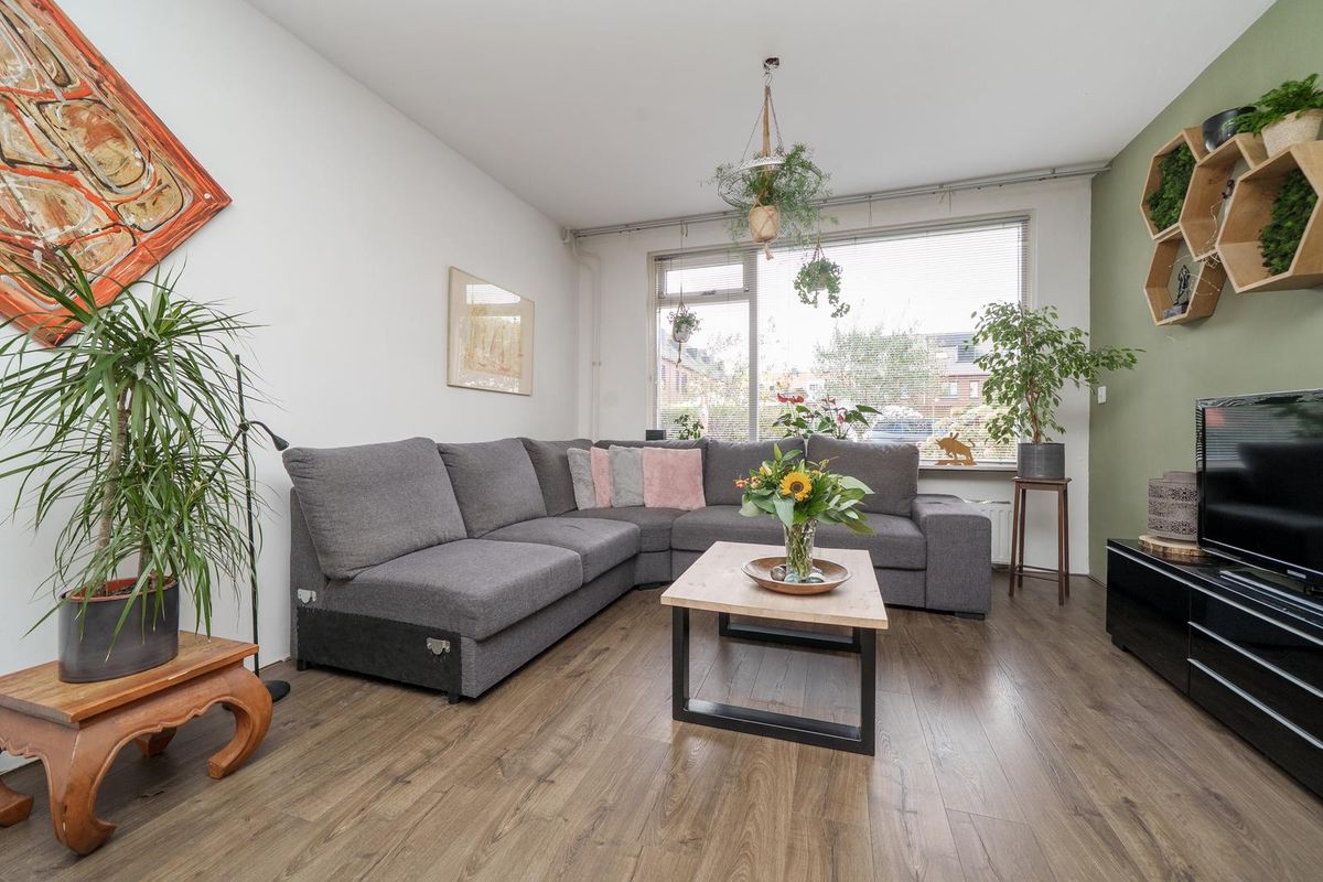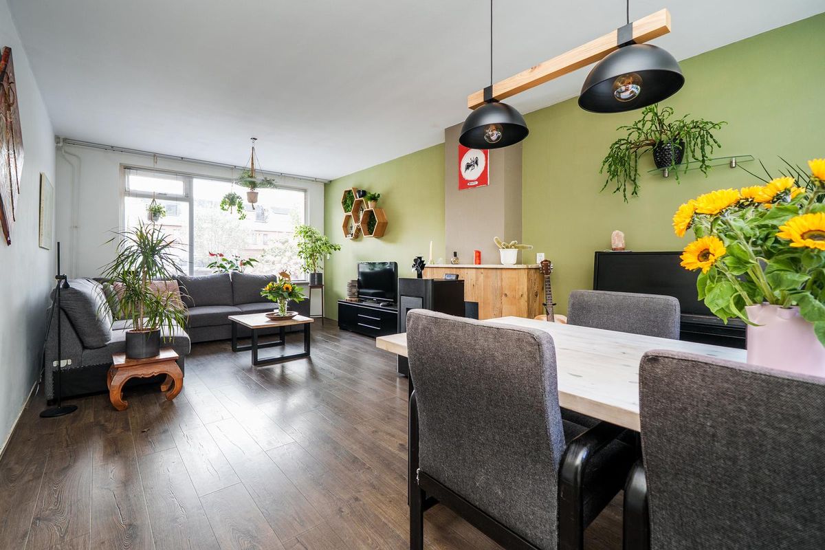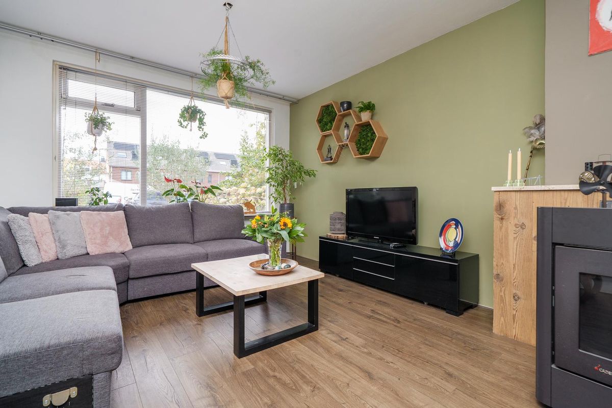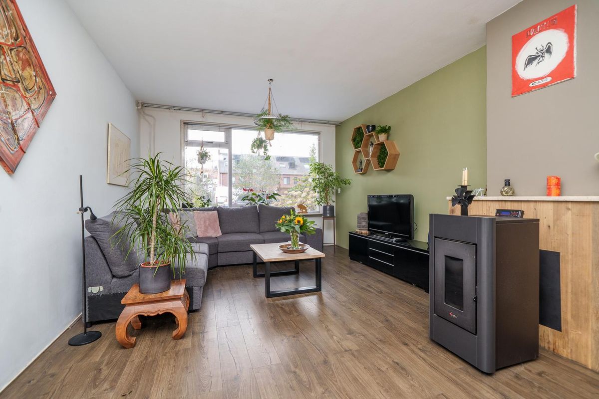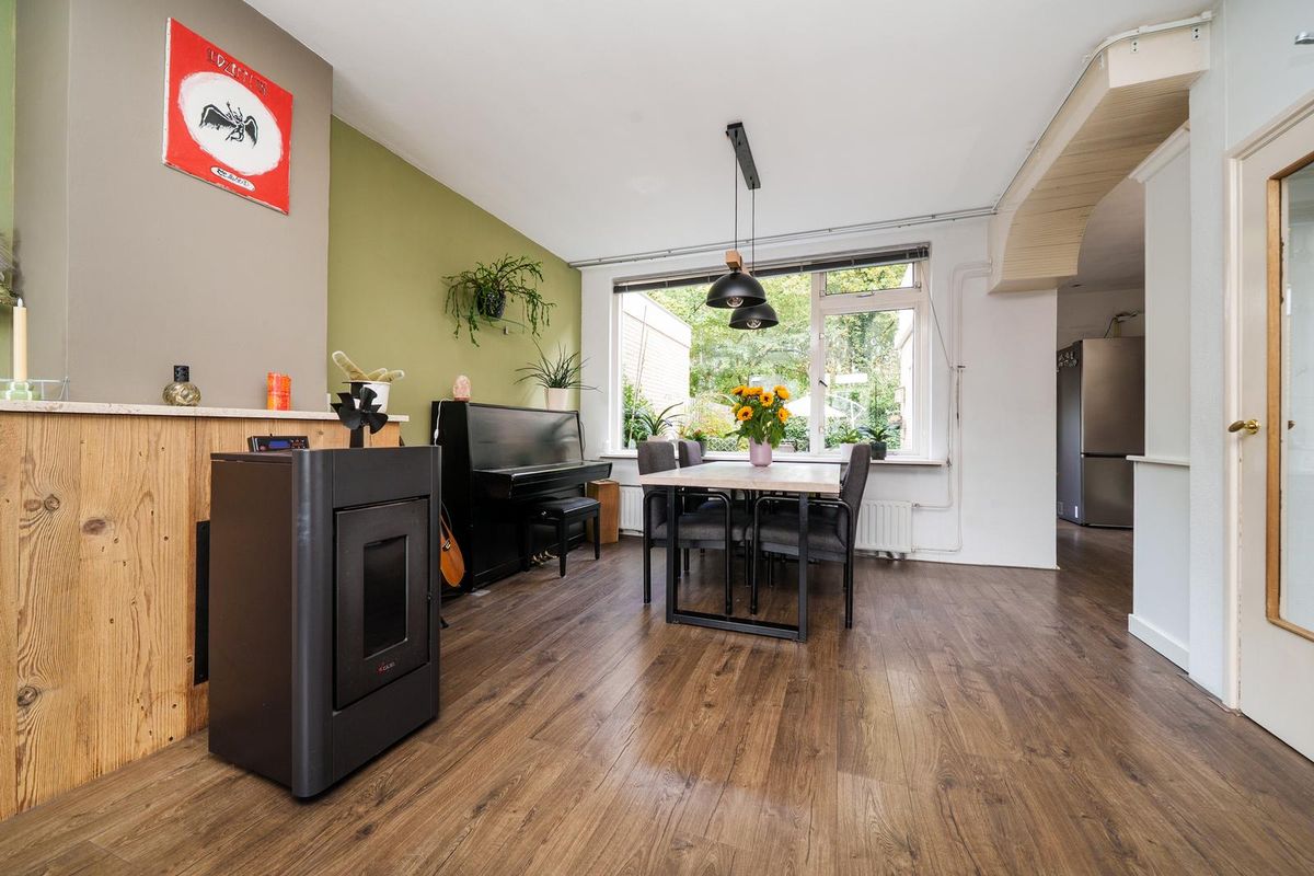 * Ruime, doorzon woonkamer. De woonkamer is voorzien van een laminaatvloer, en een palletkachel;