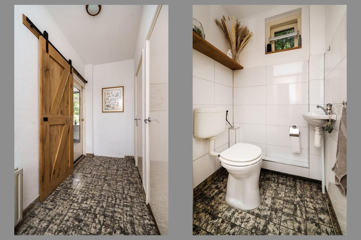 * Hal met meterkast, trapkast, het toilet, trapopgang naar de eerste verdieping en toegang tot de woonkamer;