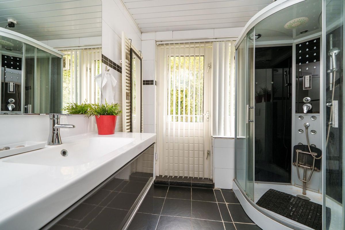 * De badkamer is voorzien van een douchecabine, bad, wastafelmeubel en toilet. Middels een deur is er toegang tot het dakterras.