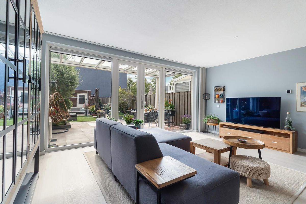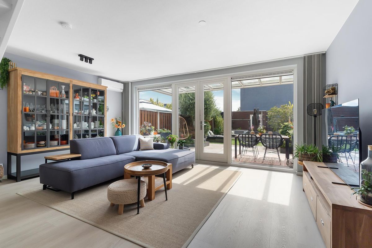 De woonkamer biedt toegang tot de royale achtertuin, die is fraai aangelegd en beschikt over ruime houten schuur en tuindeur met toegang tot een gangpad en de straat met meer parkeergelegenheid. Over de volle breedte van de woning is er een moderne glazen terrasoverkapping, voorzien van elektrische bedienbare zijpanelen en zonnescherm via een app en/of afstandsbediening. Of het nu hoogzomer is of een frisse herfstavond, hier geniet je het hele jaar door van het buitenleven.