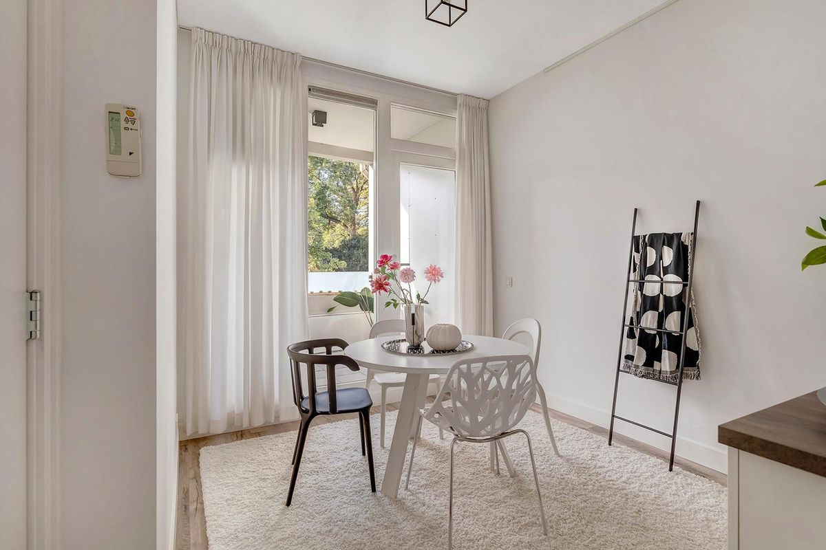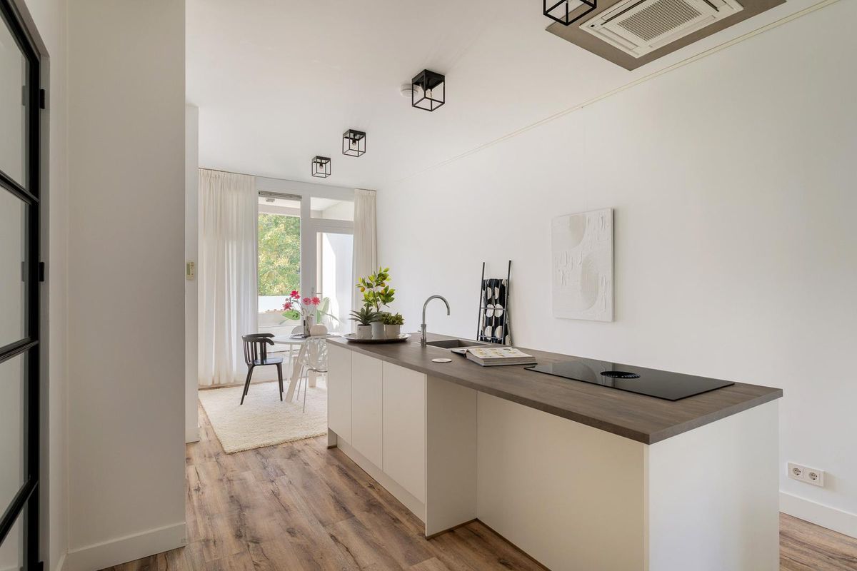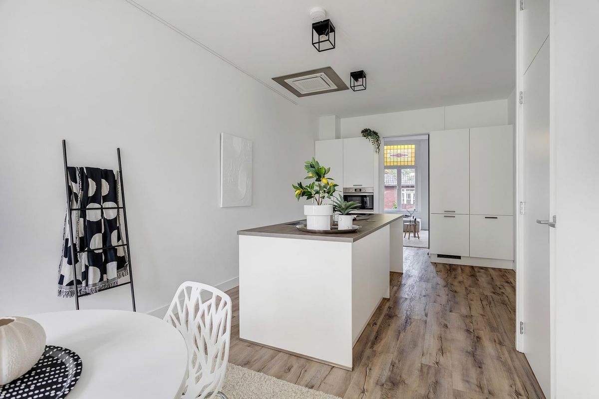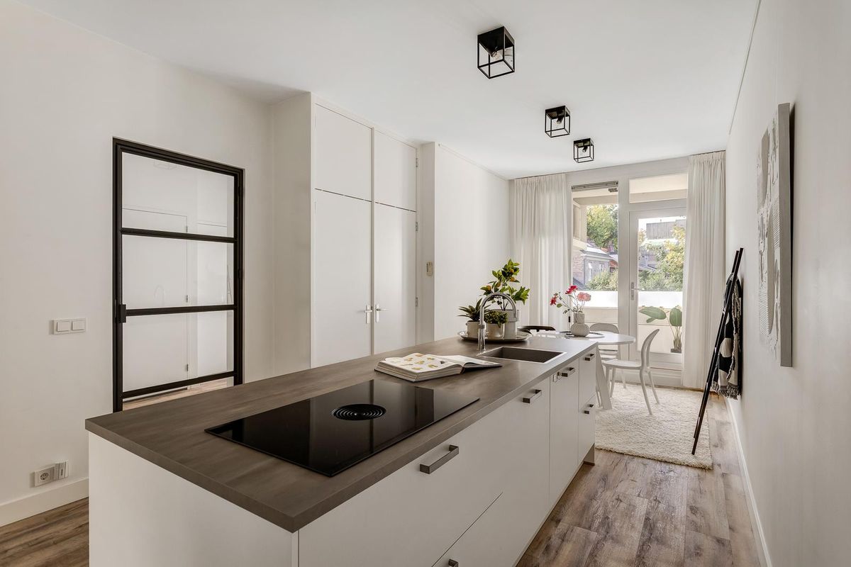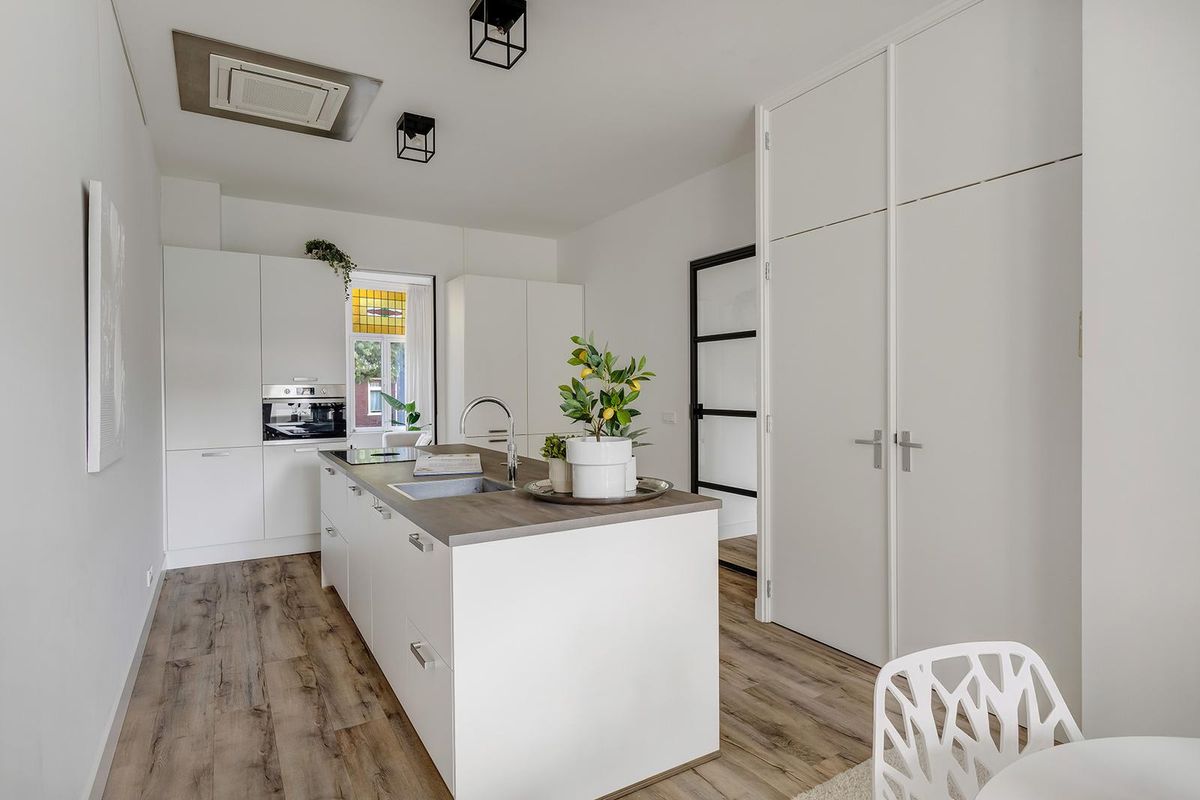Via een eigen overloop stap je binnen in een lichte hal met bergruimte en een stoere stalen deur naar de leefkeuken (circa 3.45/2.75 x 7.20 m). Het kookeiland nodigt uit tot samen koken en borrelen, met alles bij de hand, te weten een Bora inductie kookplaat, Quooker, vaatwasser, combi-oven/magnetron, koelkast en vriezer.