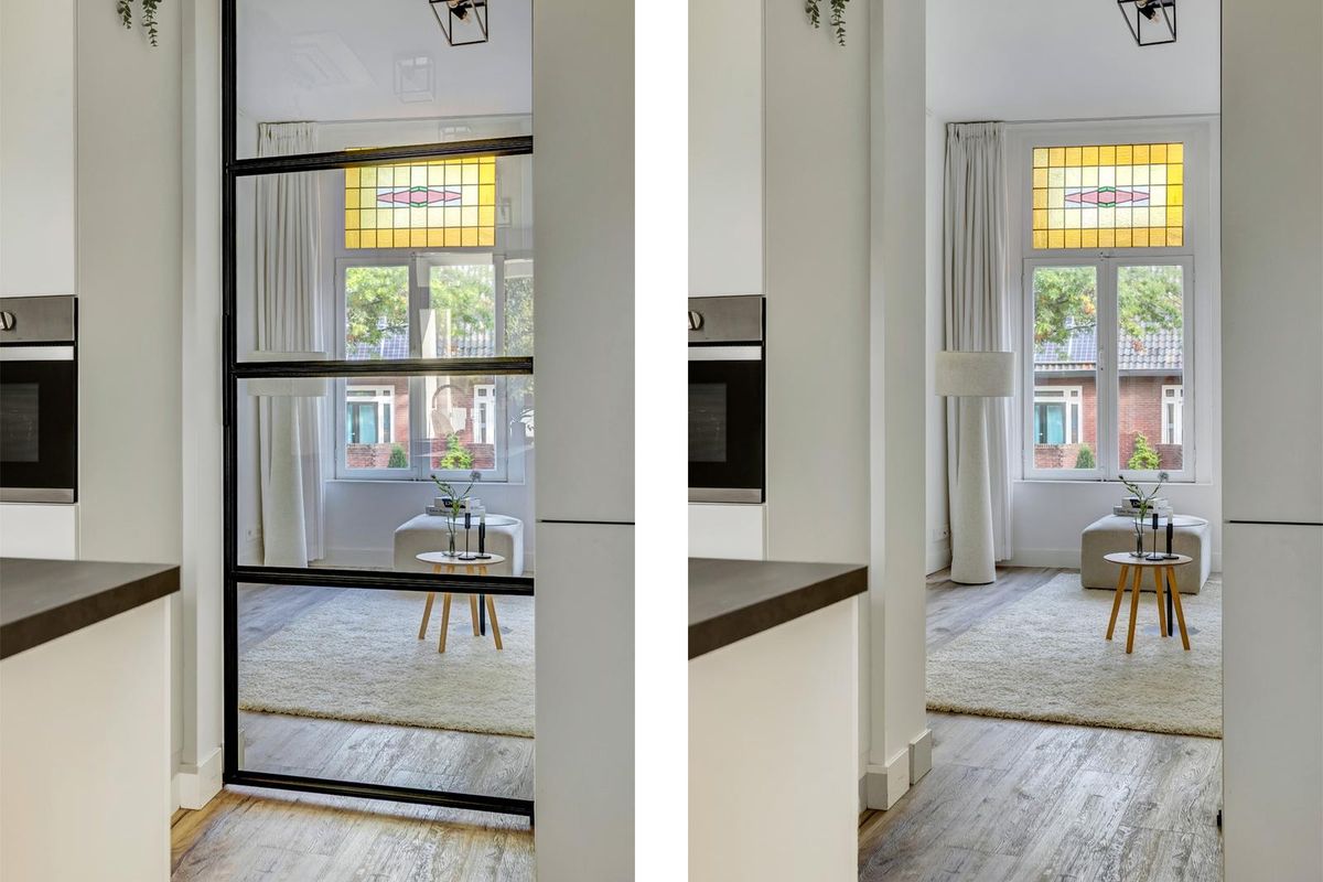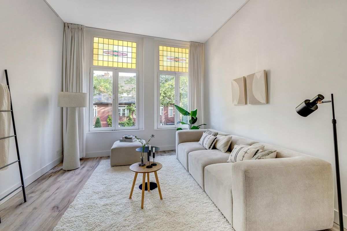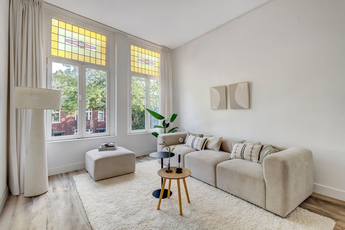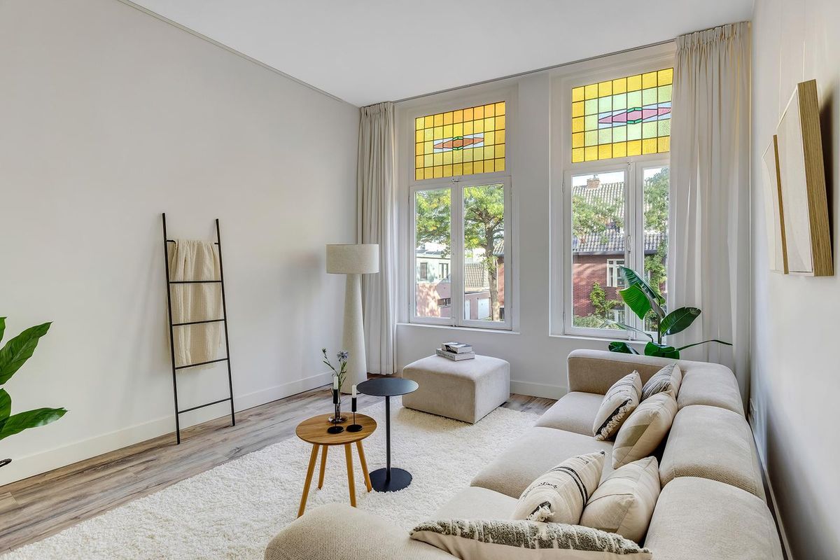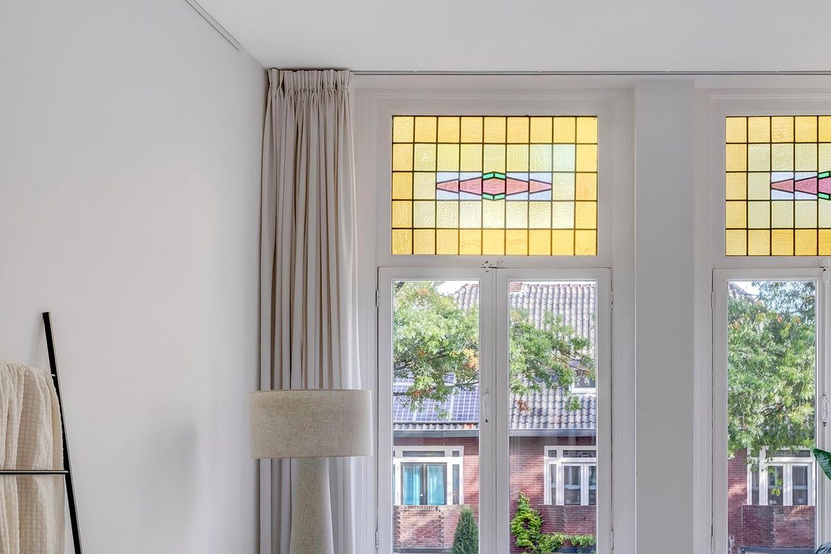 Via de schuifdeur kom je in de woonkamer (circa 3.45 x 4.25 m) met haar kenmerkende glas-in-lood ramen, die je uitzicht geven op het straatbeeld.
