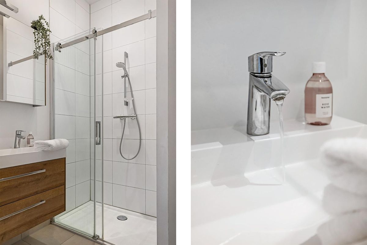 De badkamer (circa 2.05 x 1.90 m) is strak en praktisch, met inloopdouche, wastafelmeubel en vloerverwarming.