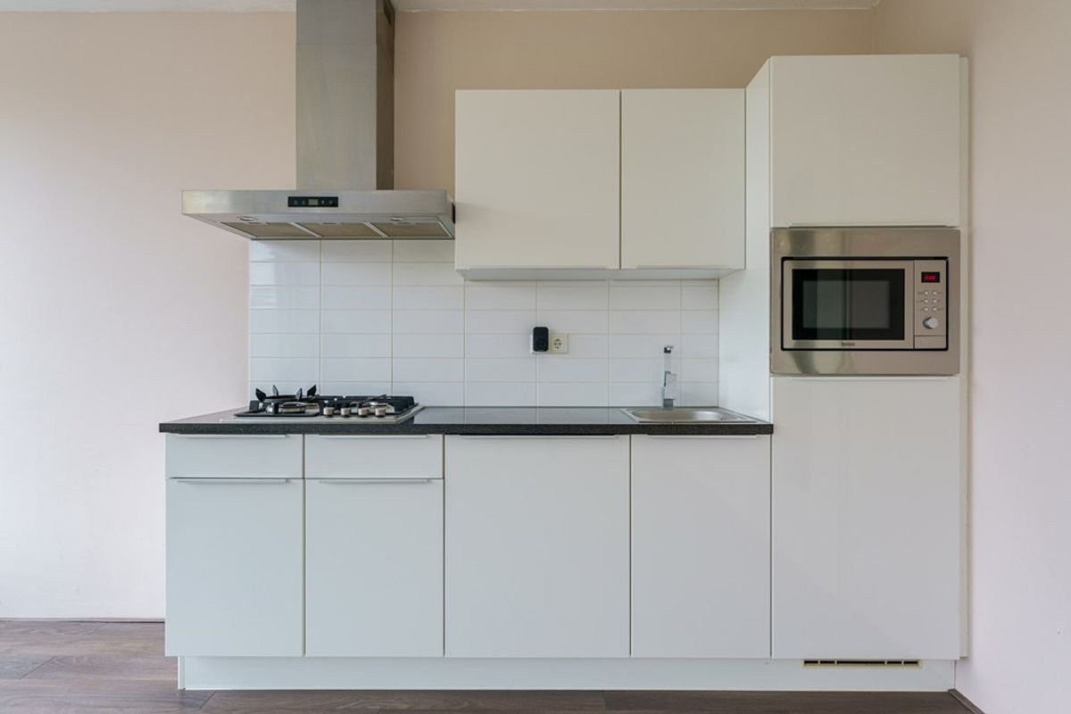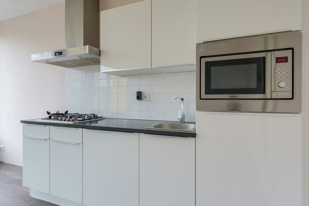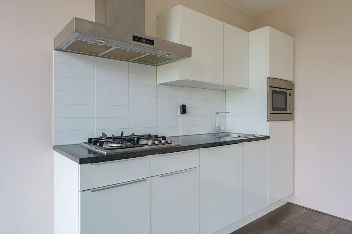 De open keuken is compleet uitgerust met een afzuigkap, inductiekookplaat, combimagnetron, koelkast met vriesvak, vaatwasser en voldoende kastruimte.