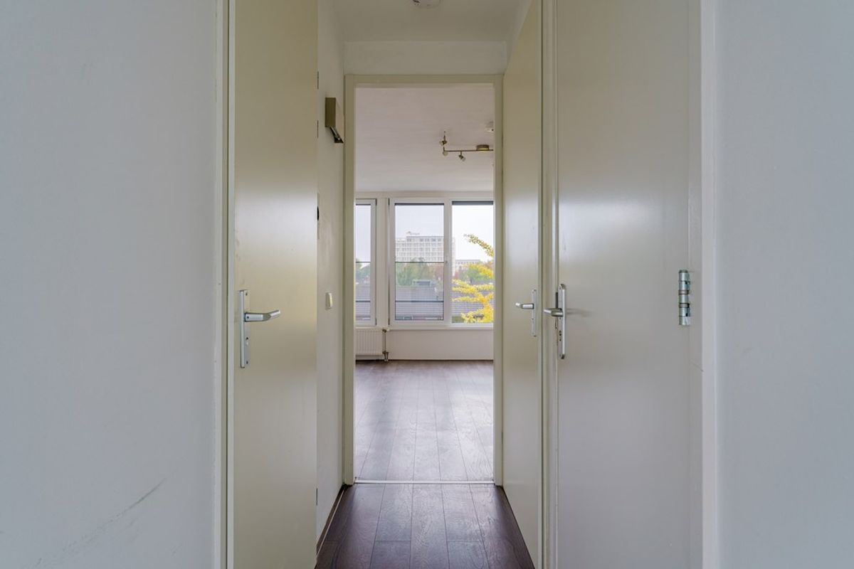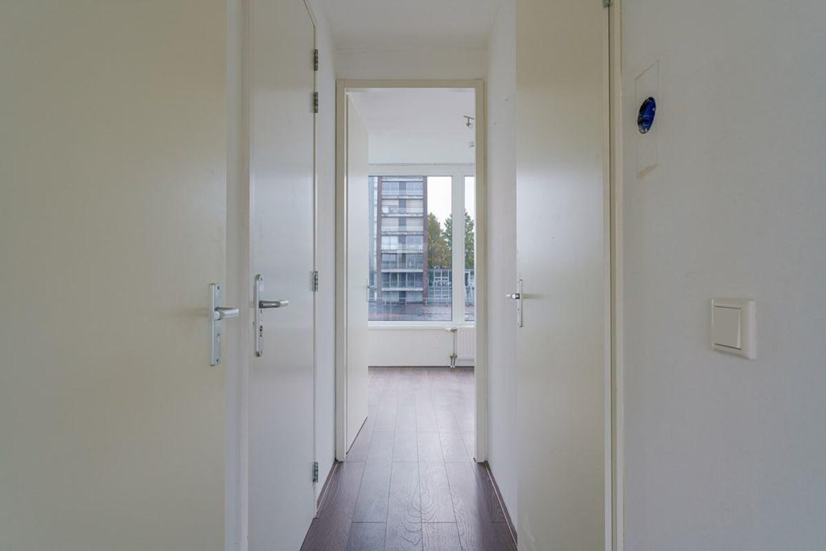 Entree: De hal geeft toegang tot de woonkamer, de slaapkamer en de badkamer. Daarnaast bereikt u vanuit de hal de deels betegelde toiletruimte, voorzien van een modern, zwevend toilet.