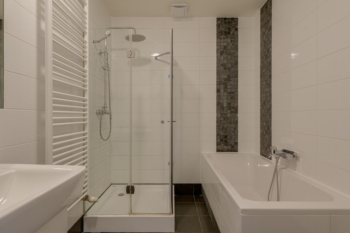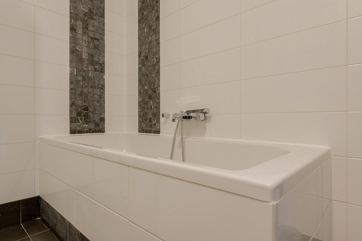 De badkamer is praktisch en ruim ingedeeld, met een aparte douche, ligbad voorzien van thermostaatkraan, een vaste wastafel en designradiator. Ook de aansluiting voor wasmachine en droger bevindt zich hier, wat bijdraagt aan het comfort en gebruiksgemak.