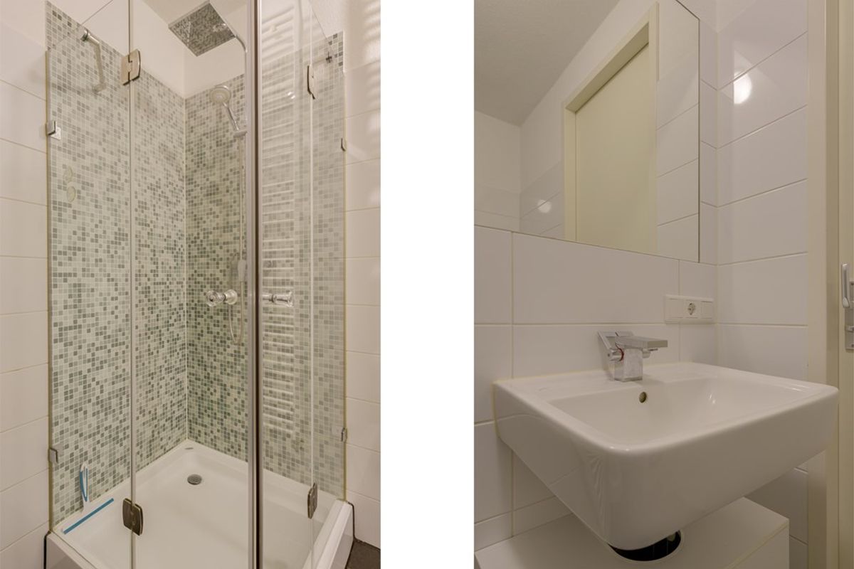 The bathroom is spacious and practically furnished with a separate shower with thermostat tap, a washbasin, and a designer radiator.
