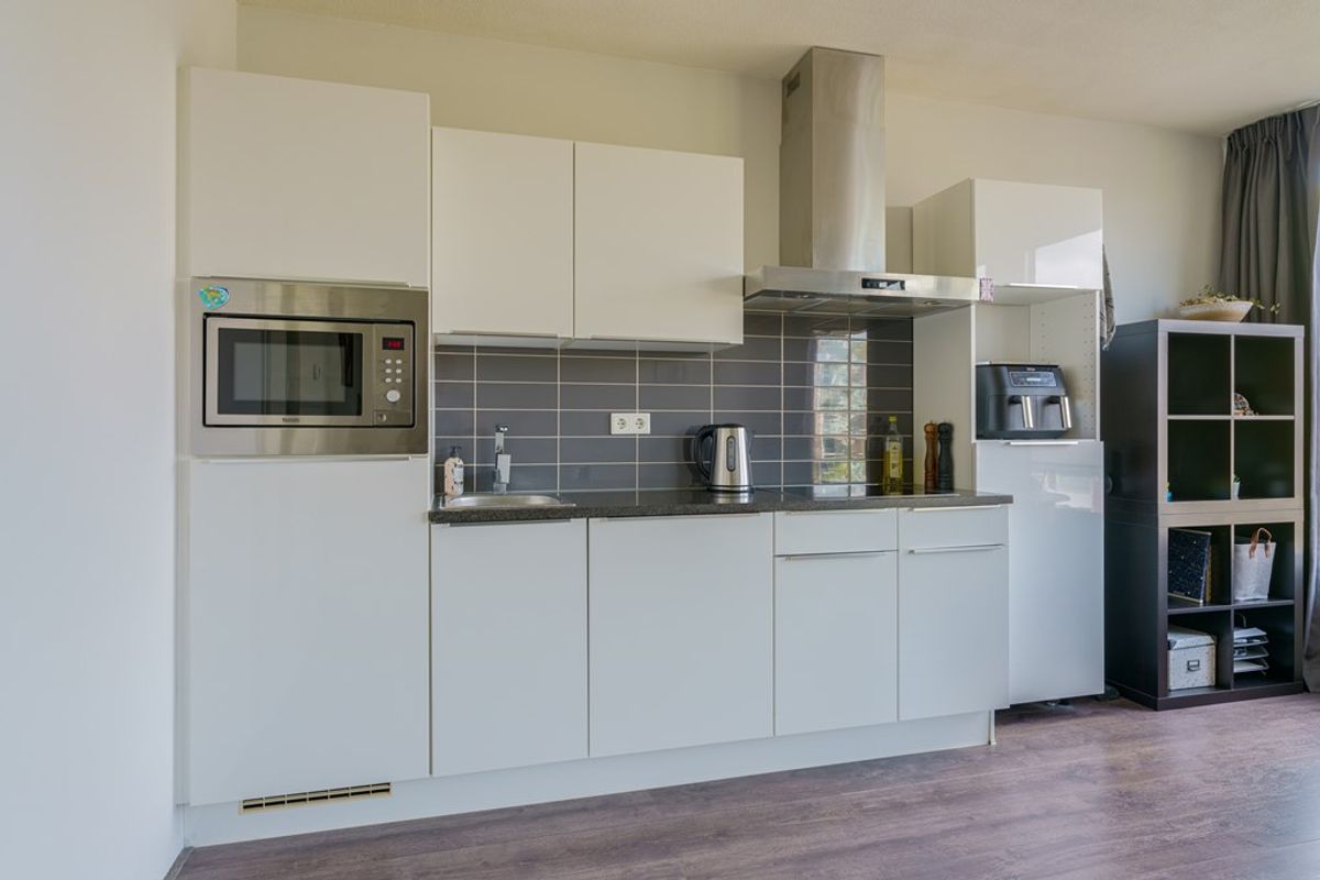 De open keuken is voorzien van een afzuigkap, inductiekookplaat, combimagnetron, koelkast met vriesvak, vaatwasser en voldoende opbergruimte.