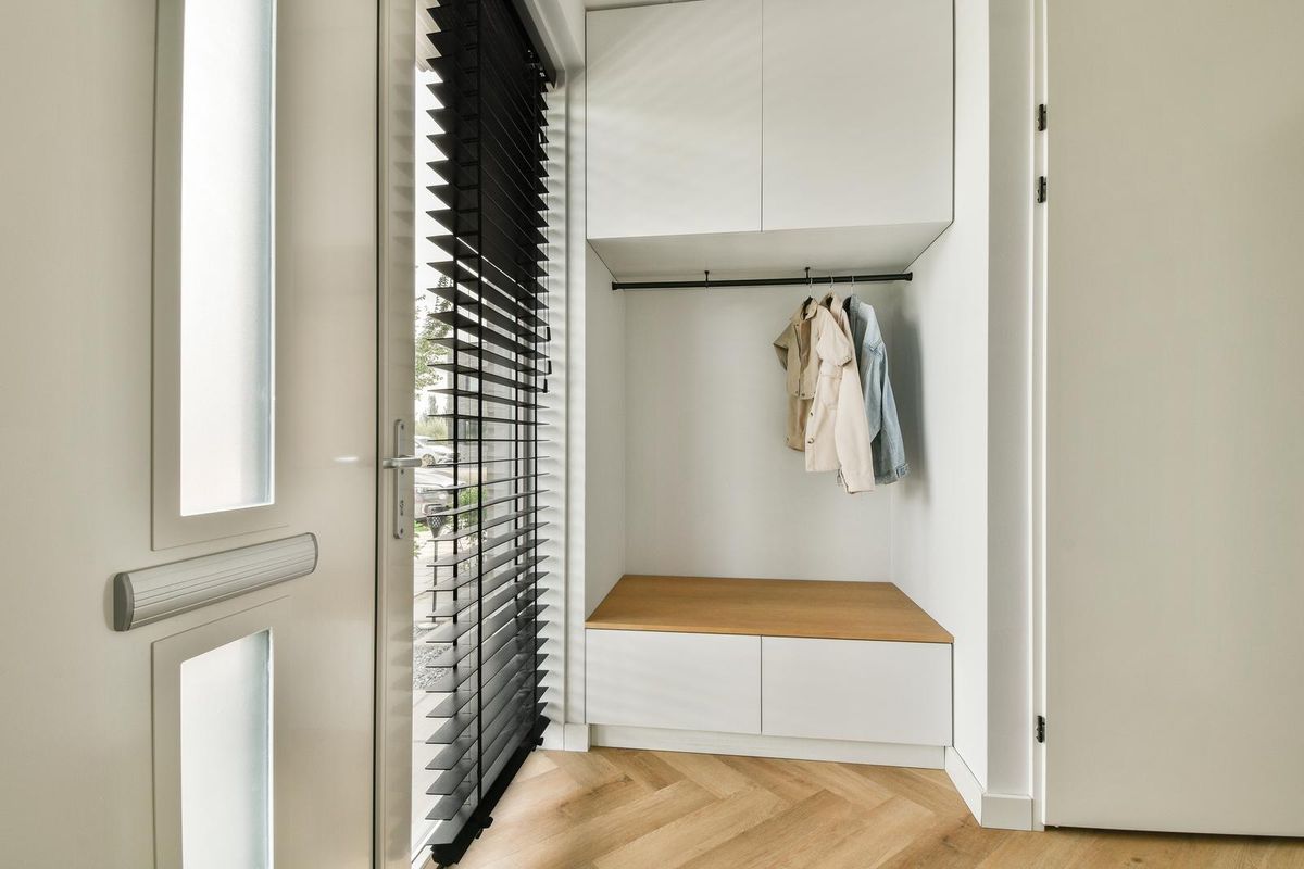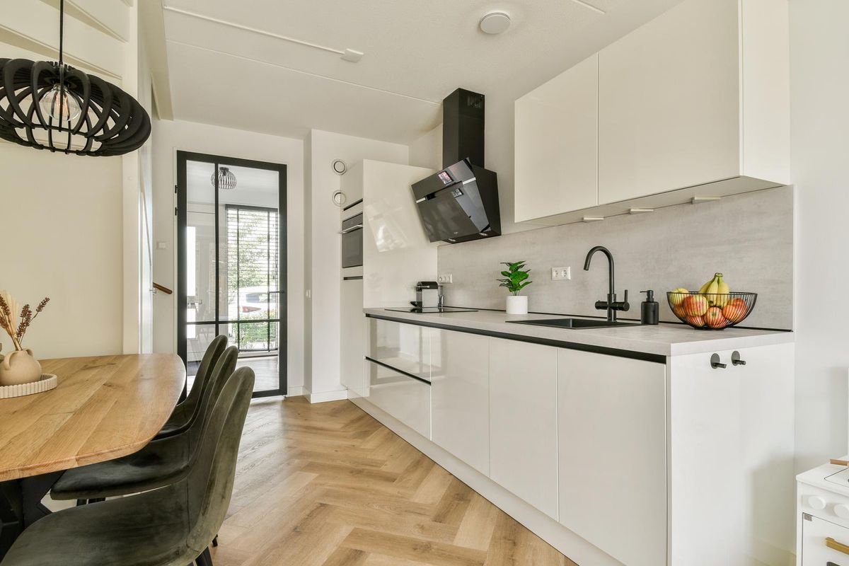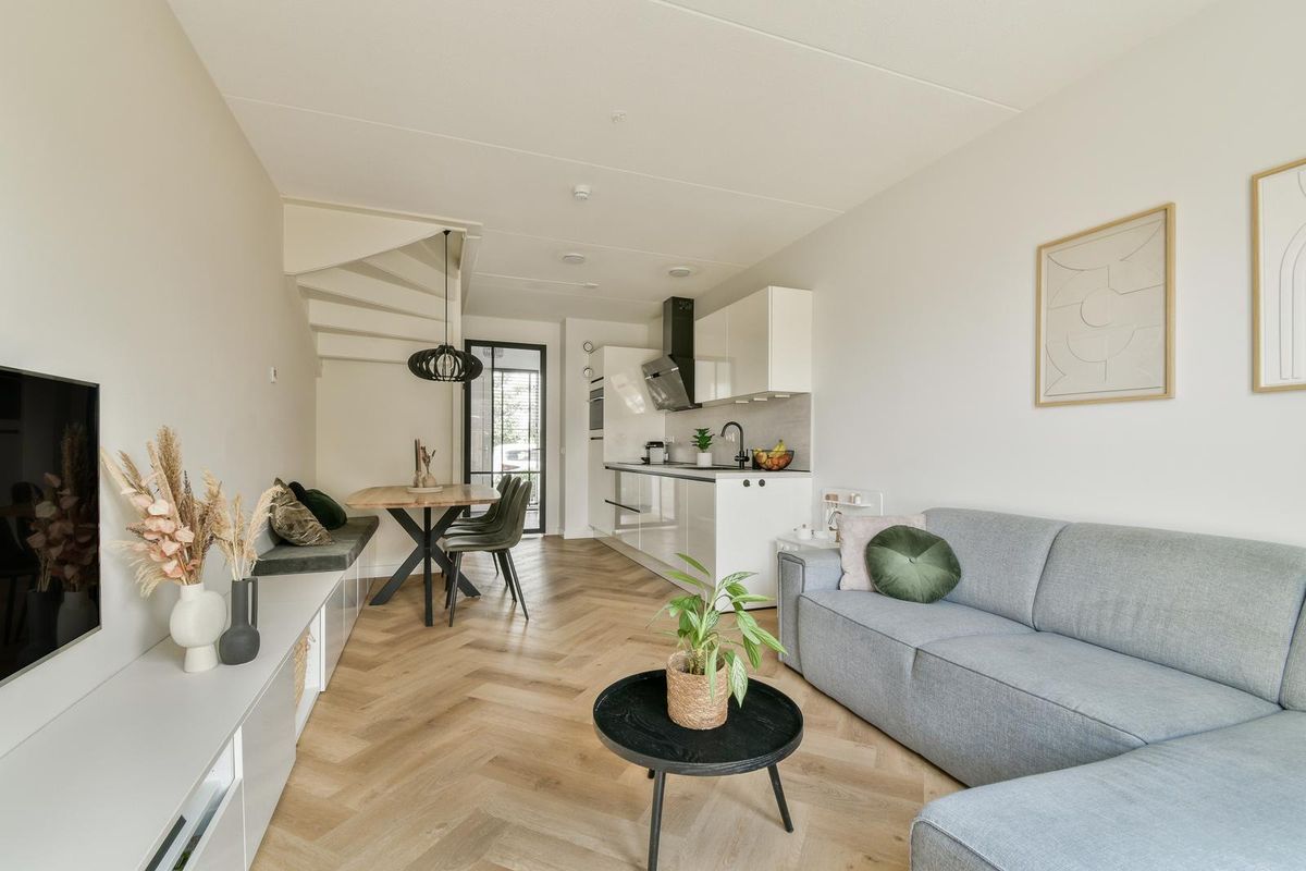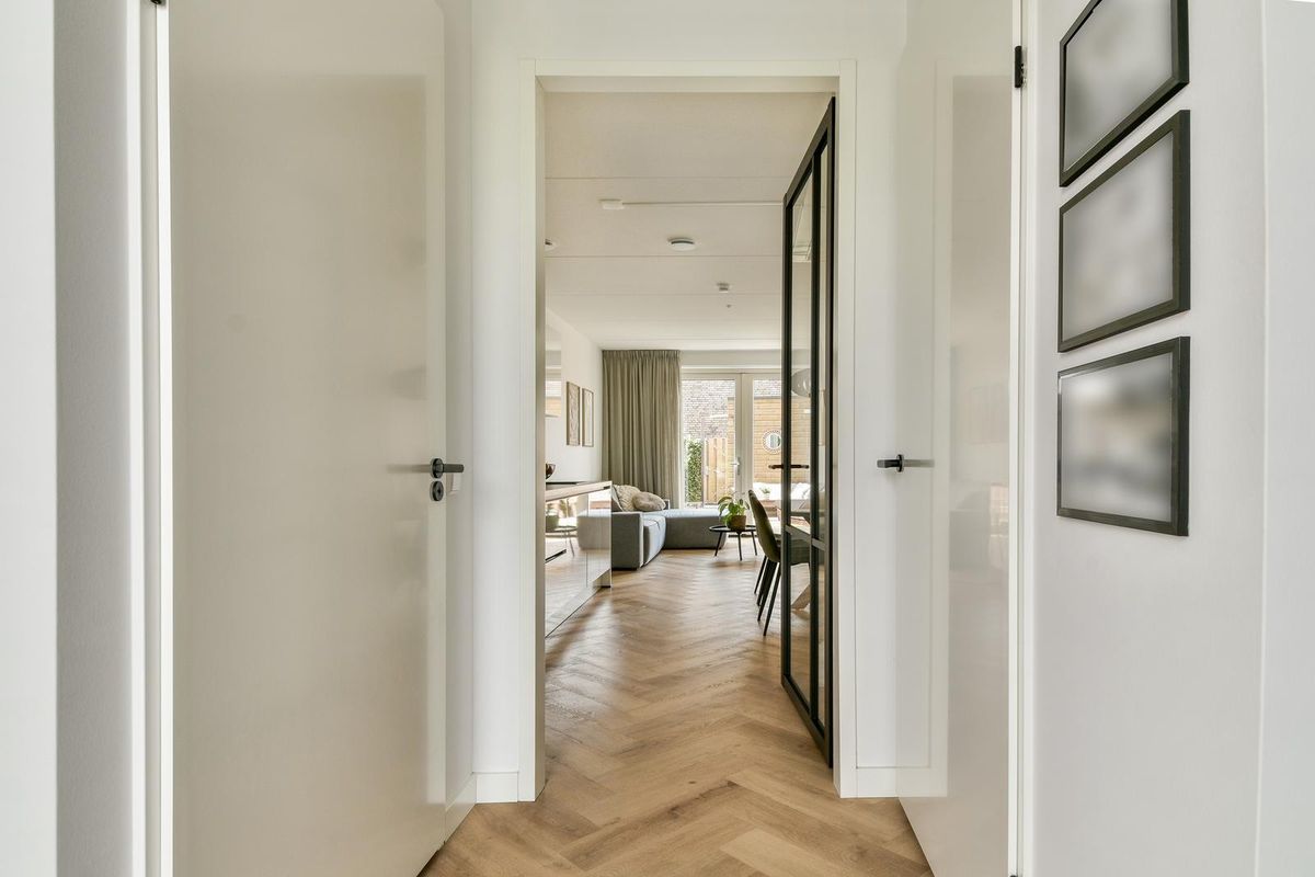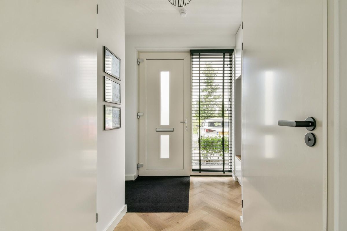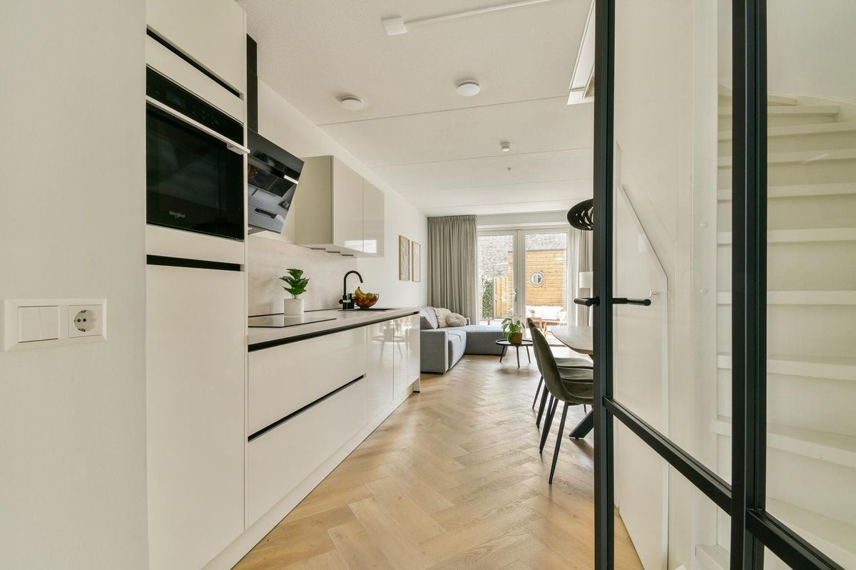 Voortuin met vrij uitzicht op water en groen en veel openbare parkeergelegenheid in de straat. Entree, ruime hal met meterkast, kast met warmtepompinstallatie, modern betegeld toilet v.v. wandcloset en fonteintje en via een industriële deur toegang tot de woonkamer en keuken. De woonkamer ligt aan de achterzijde. Door de uitbouw is er extra veel ruimte ontstaan. Aan de voorzijde ligt de open keuken. De keuken is uitgerust met een inductiekookplaat, een heet water kraan, een wandschouwafzuigkap, een vaatwasser, een koelkast en een combi-oven. Er is veel opbergruimte dankzij de onder- en bovenkasten. Daarnaast zorgt de trapkast voor extra bergruimte. Er is in de keuken plek voor een eettafel, waardoor er een echte leefkeuken ontstaat. De gehele begane grond beschikt over een visgraat PVC-vloer met vloerverwarming en -koeling en tripleglas.