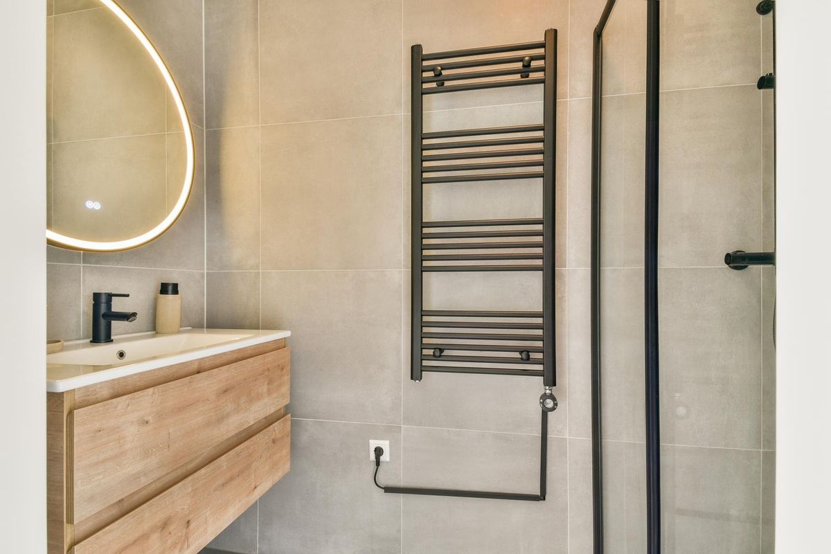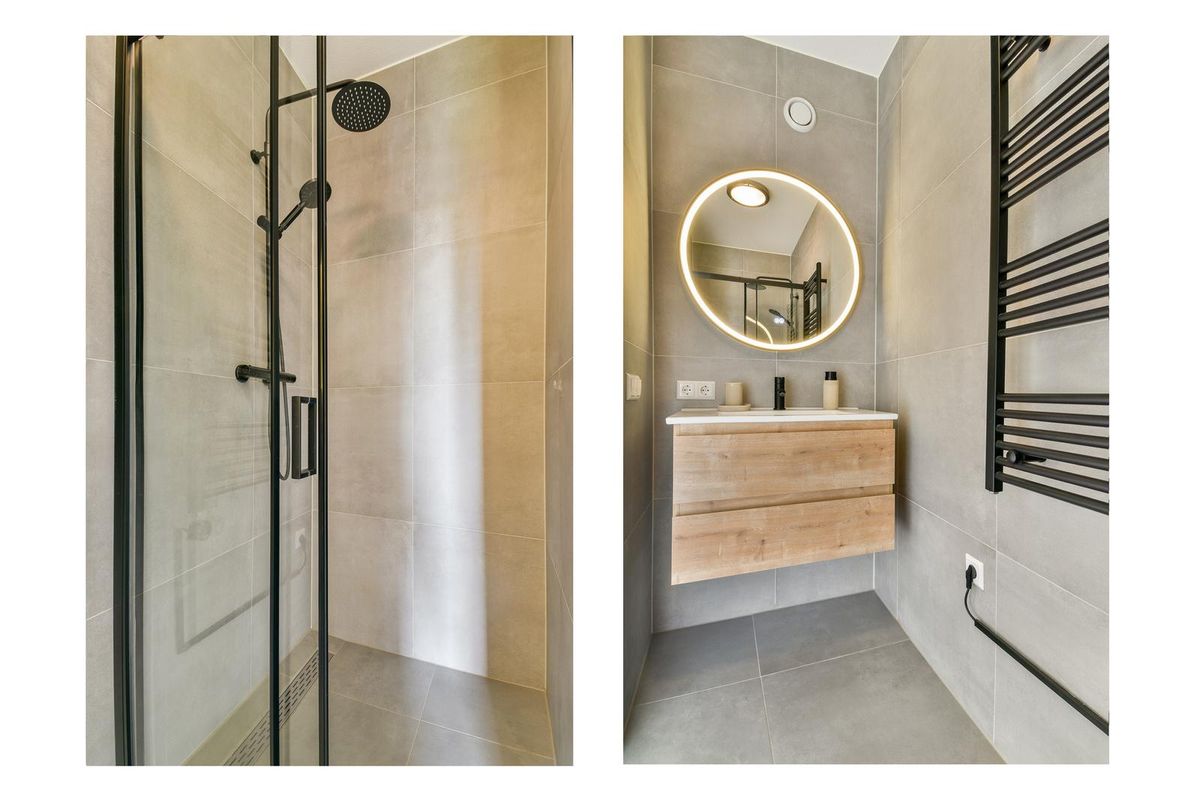 Overloop met toegang tot twee slaapkamers en de badkamer. De grootste slaapkamer ligt aan de achterzijde, is voorzien van een elektrisch rolluik en loopt over de gehele breedte. De andere slaapkamer ligt samen met de badkamer aan de voorzijde, ook deze slaapkamer loopt over de gehele breedte. De badkamer is voorzien van een inloopdouche met regendouche, een wastafel met meubel en verlichte spiegel en een designradiator. De badkamer is volledig betegeld en stijlvol afgewerkt met moderne elementen. De gehele verdieping is voorzien van vloerverwarming en -koeling en tripleglas. Op de overloop en in de slaapkamers ligt een laminaatvloer.