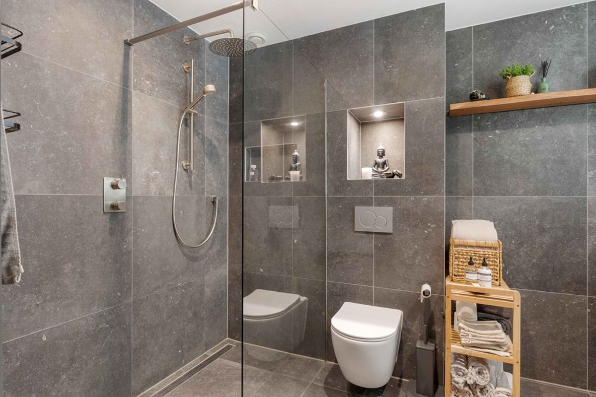 Op de eerste verdieping bevinden zich vier ruime slaapkamers, waarvan twee aan de voorzijde en twee aan de achterzijde van de woning. De badkamer is luxe uitgevoerd en voorzien van een stijlvol wastafelmeubel, een tweede toilet en een inloopdouche. Daarnaast is er een inpandige berging met ruimte voor de wasmachine en droger, evenals de cv installatie en de hybride warmtepomp.