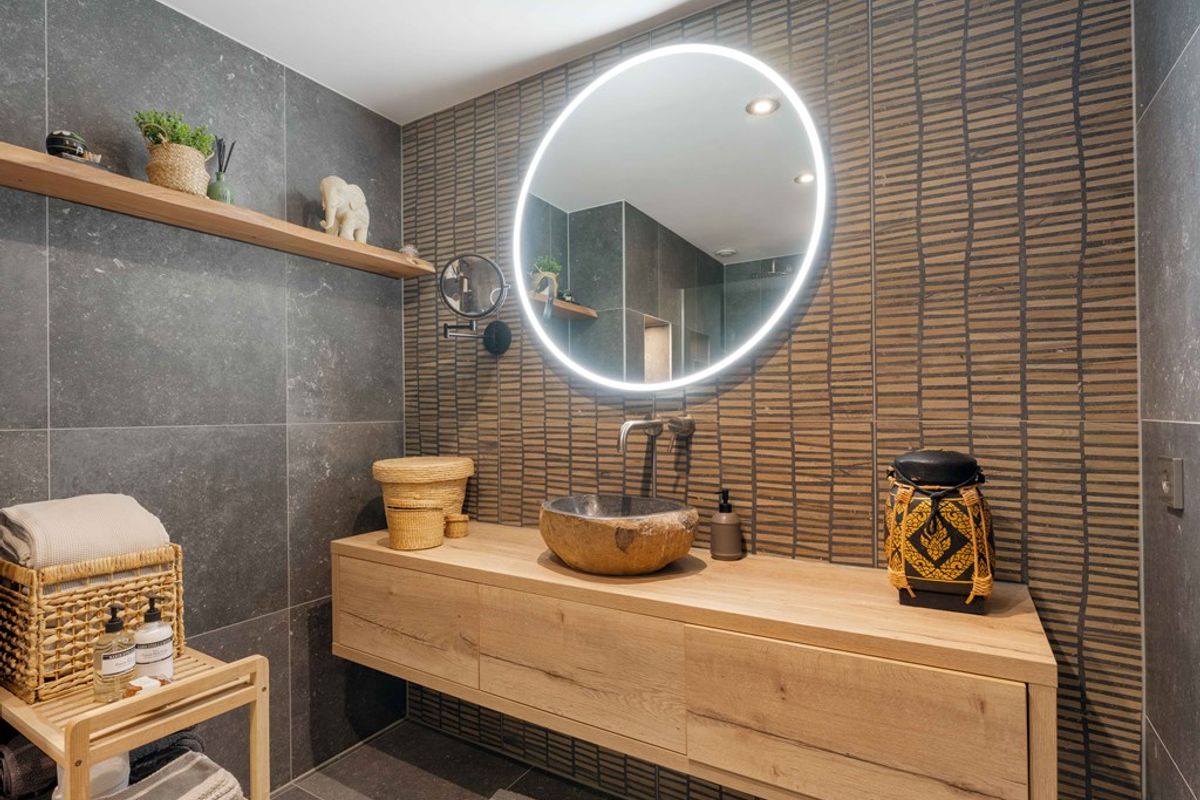 From the kitchen a small step down leads to the living room. This playful split level layout creates a natural separation between cooking and relaxing and gives the home extra character. The living room spans the full width of the house and benefits from abundant natural light thanks to the large sliding doors. From here you have direct access to the veranda by the water, a wonderful spot to sit and enjoy the view and outdoor living.