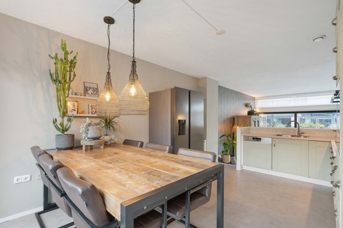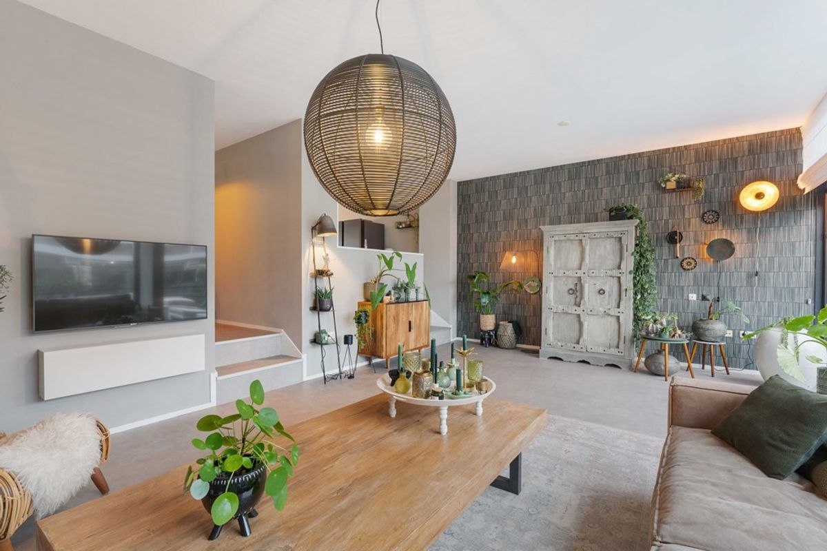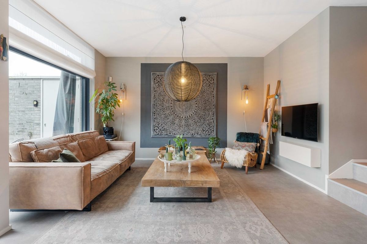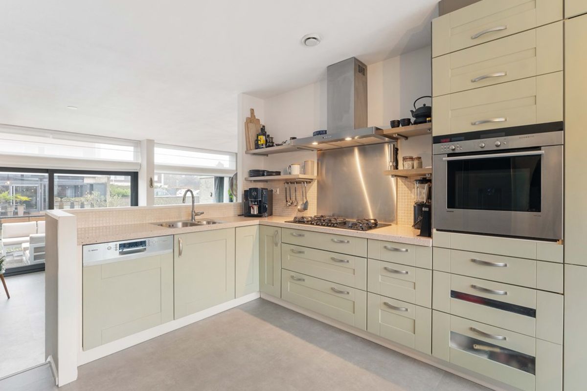 Vanuit de keuken loop je via een klein trapje naar beneden naar de woonkamer. Deze speelse splitlevel indeling zorgt voor een duidelijke scheiding tussen koken en ontspannen en geeft de woning extra karakter. De woonkamer strekt zich uit over de volledige breedte van de woning en dankzij de grote schuifpui is er veel lichtinval. Vanuit de woonkamer is er directe toegang tot de veranda aan het water, een heerlijke plek om te zitten en te genieten van het uitzicht en het buitenleven.