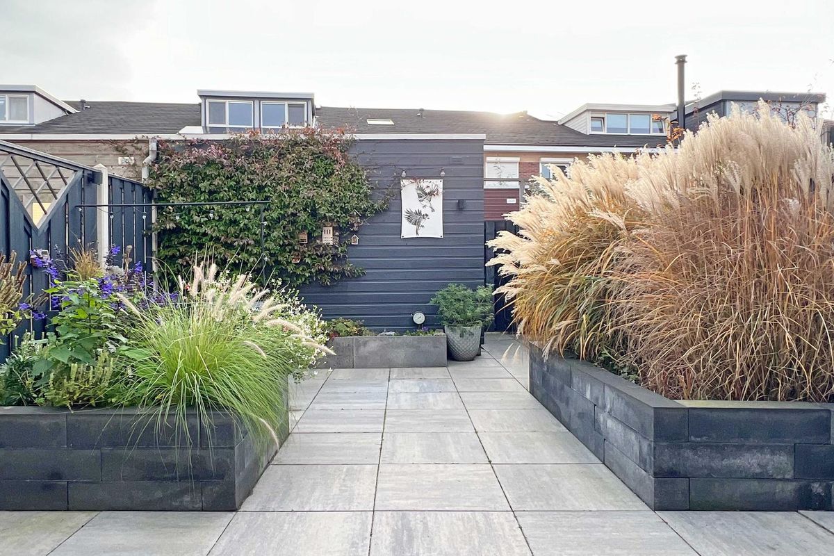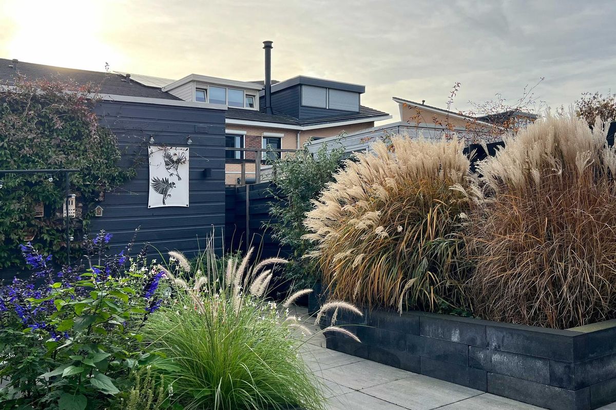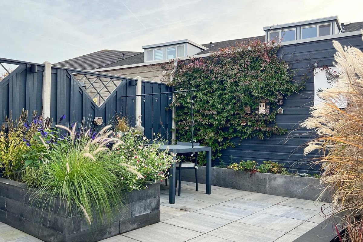 Via de schuifpui bereikt u de speels ingerichte achtertuin van 50 m2 voorzien van elektrisch zonnescherm, en met aparte berging en achterom.