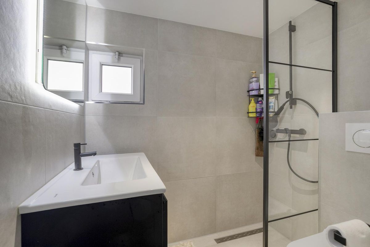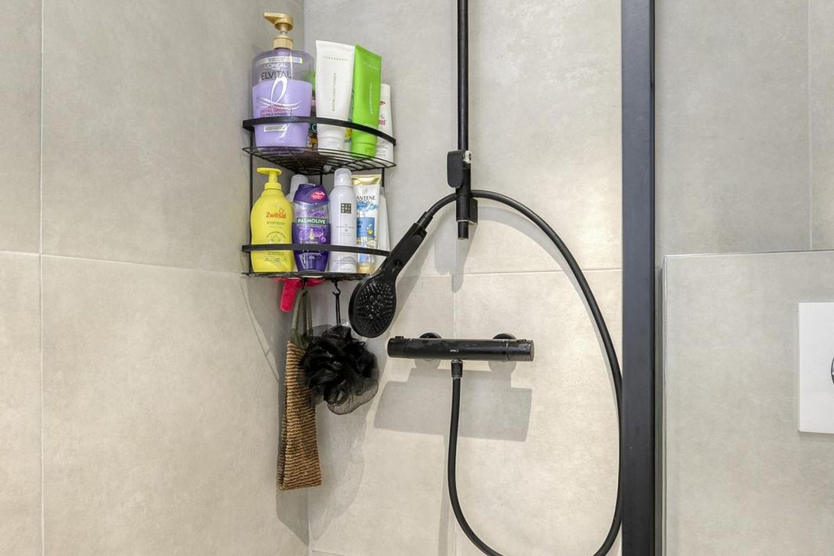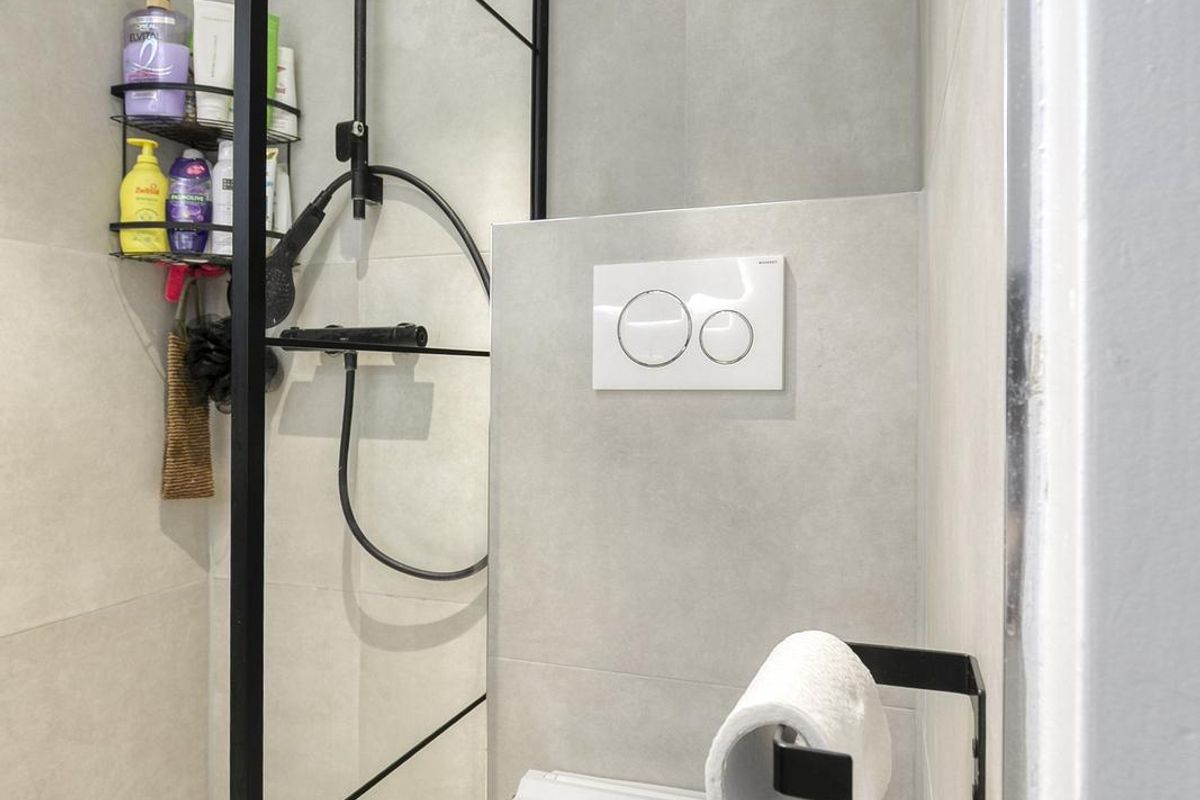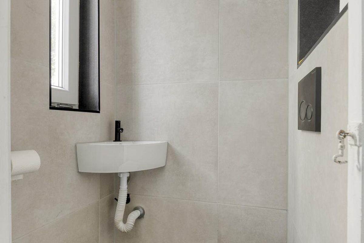 - Toilet: Het toilet is volledig betegeld en modern afgewerkt met grote lichte wandtegels en een donkere vloer voor een stijlvol contrast. De ruimte is voorzien van een hangend toilet en een compact fonteintje.