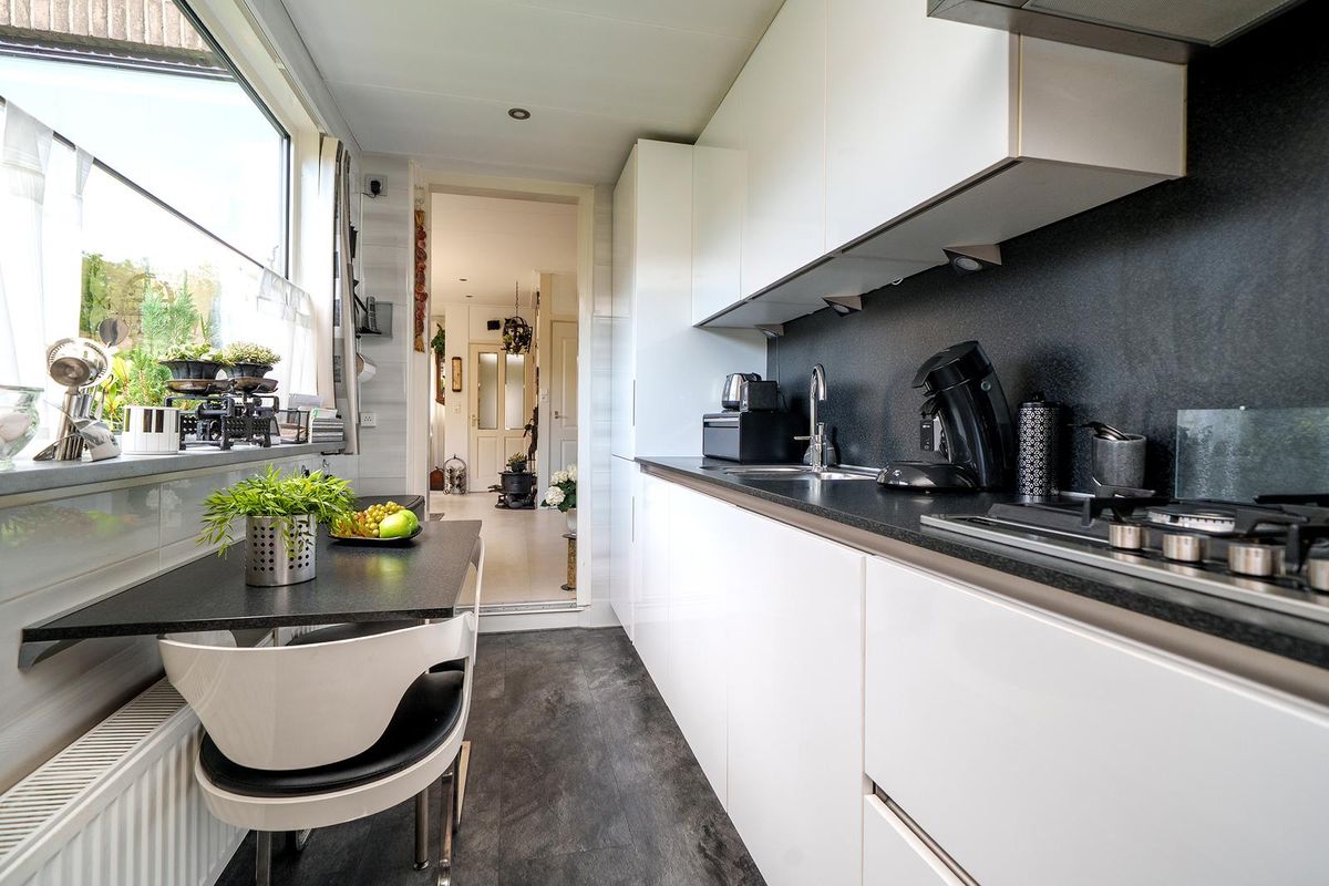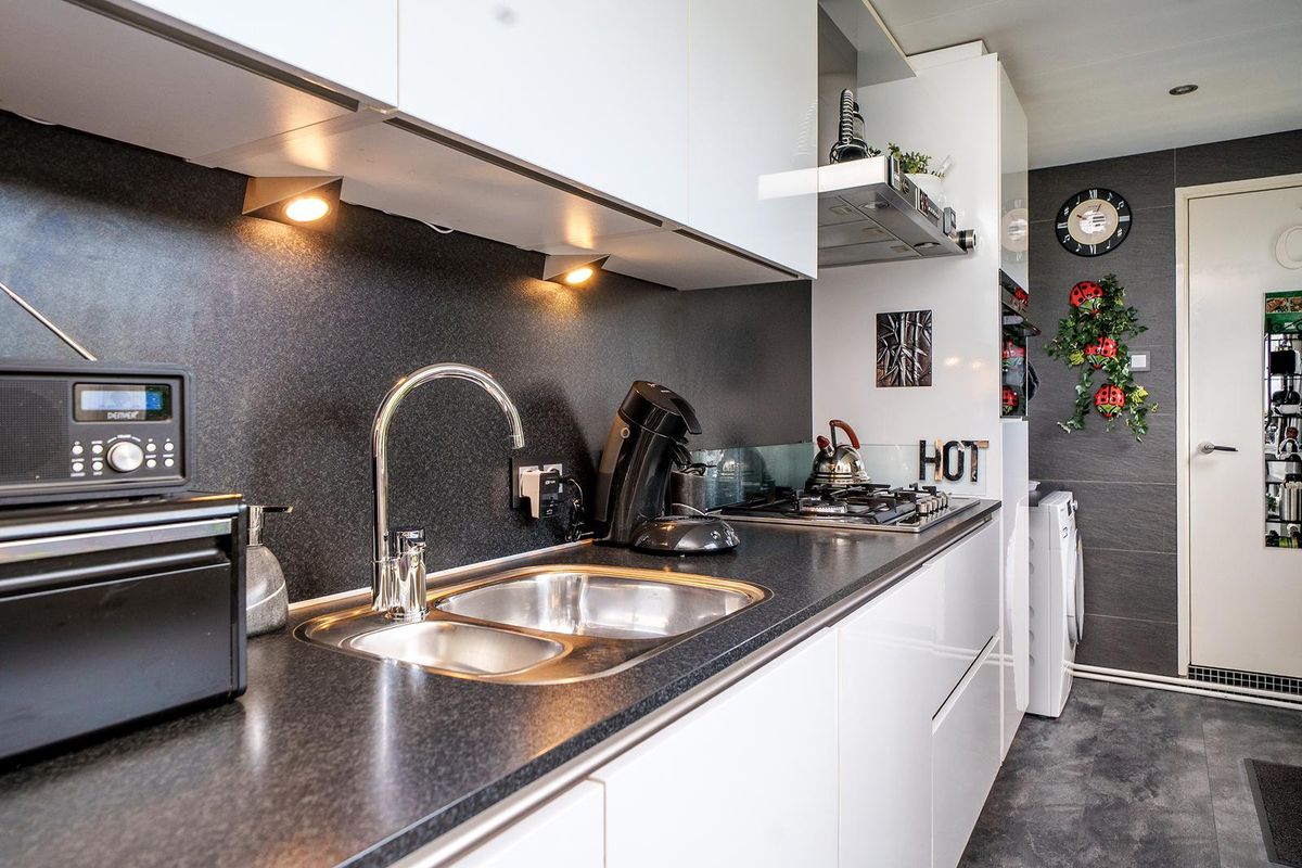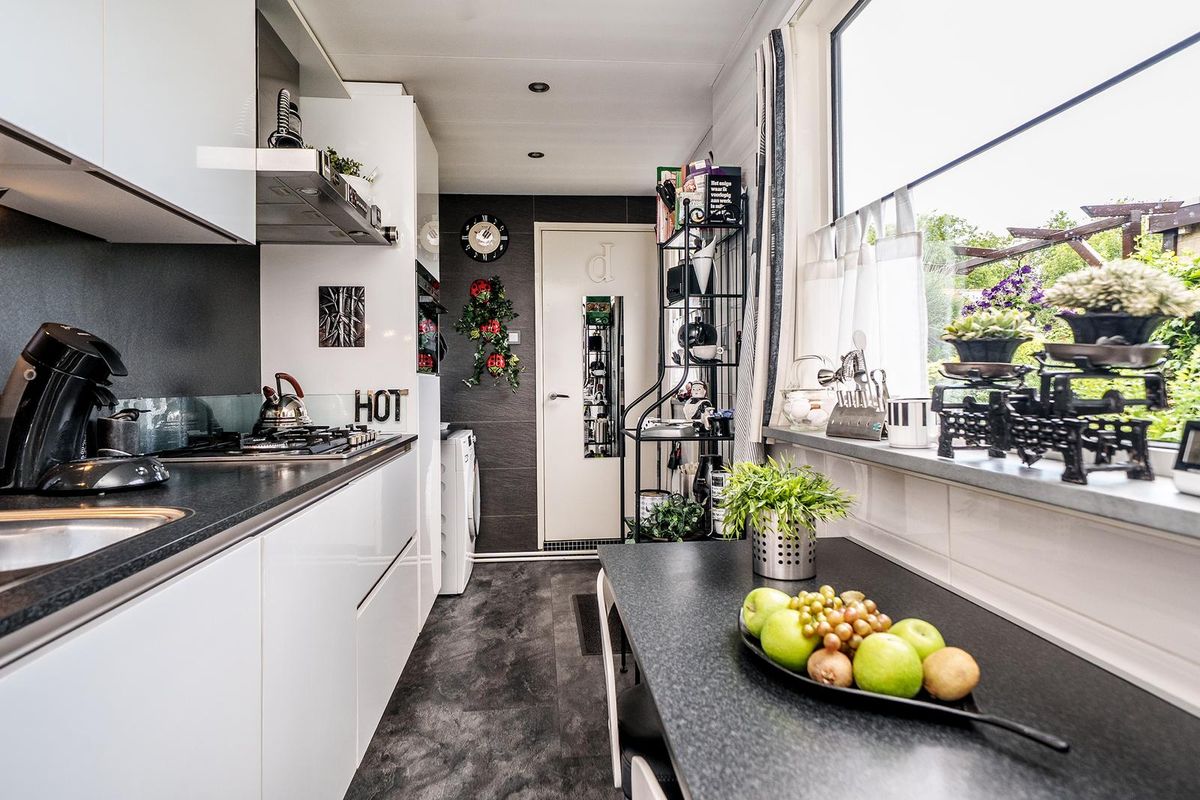 * Aan de achterzijde bevindt zich de open keuken met diverse inbouwapparatuur (gasfornuis, afzuigkap, koelkast, vriezer, combimagnetron en vaatwasser);