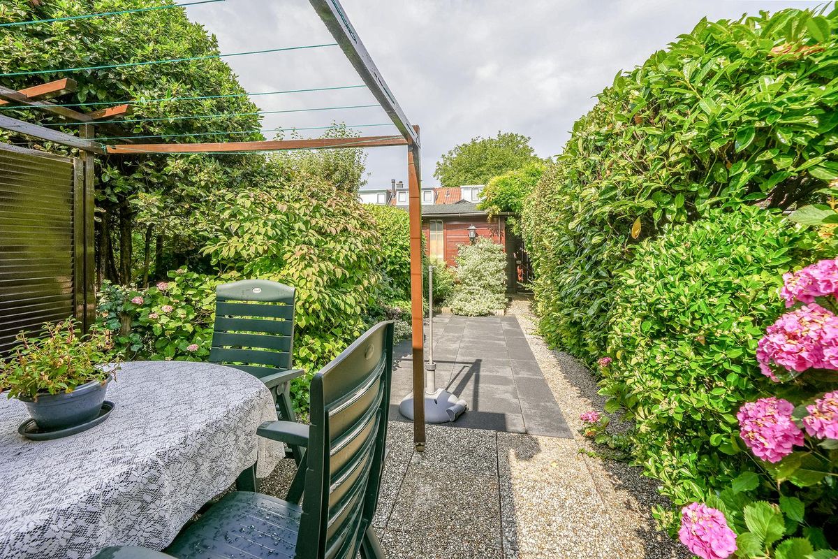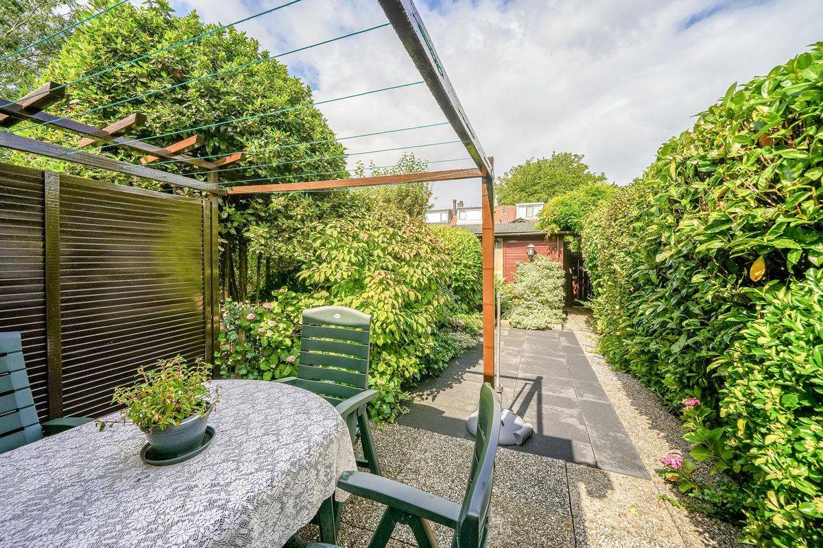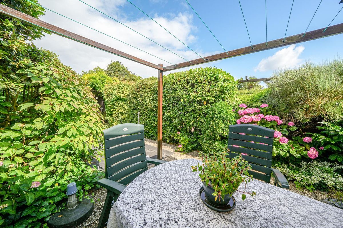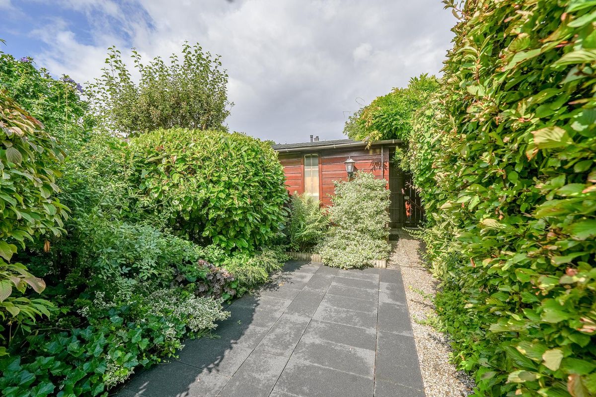 * De vrijstaande berging in de diepe achtertuin biedt praktische opbergruimte.