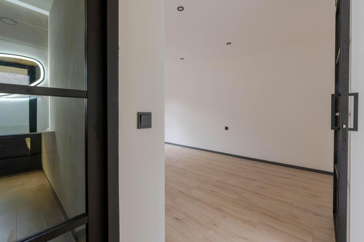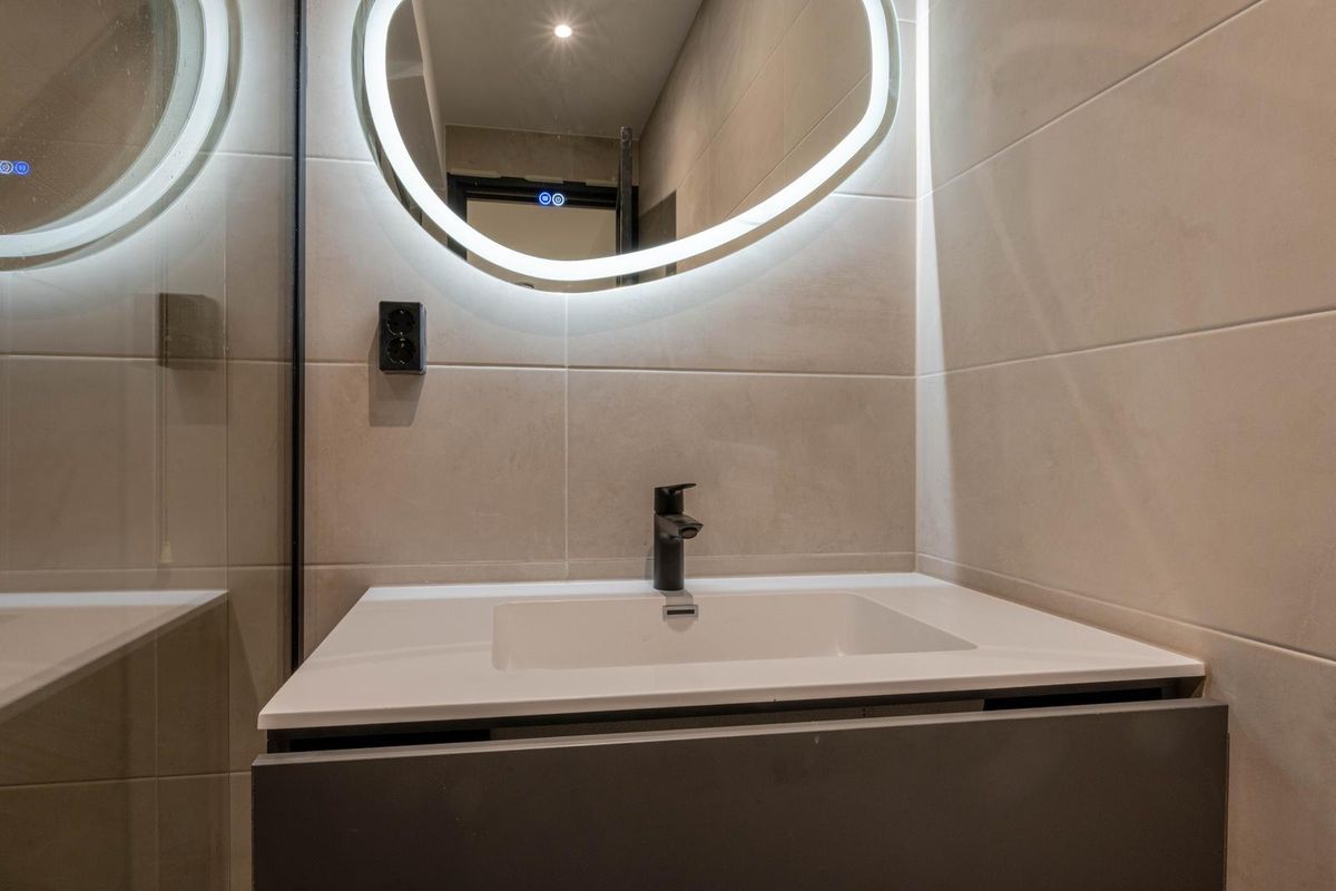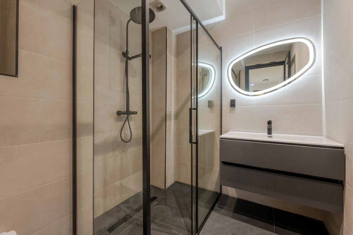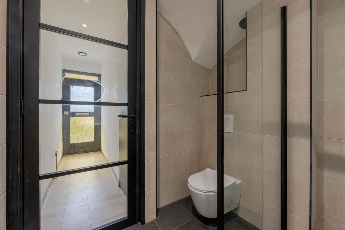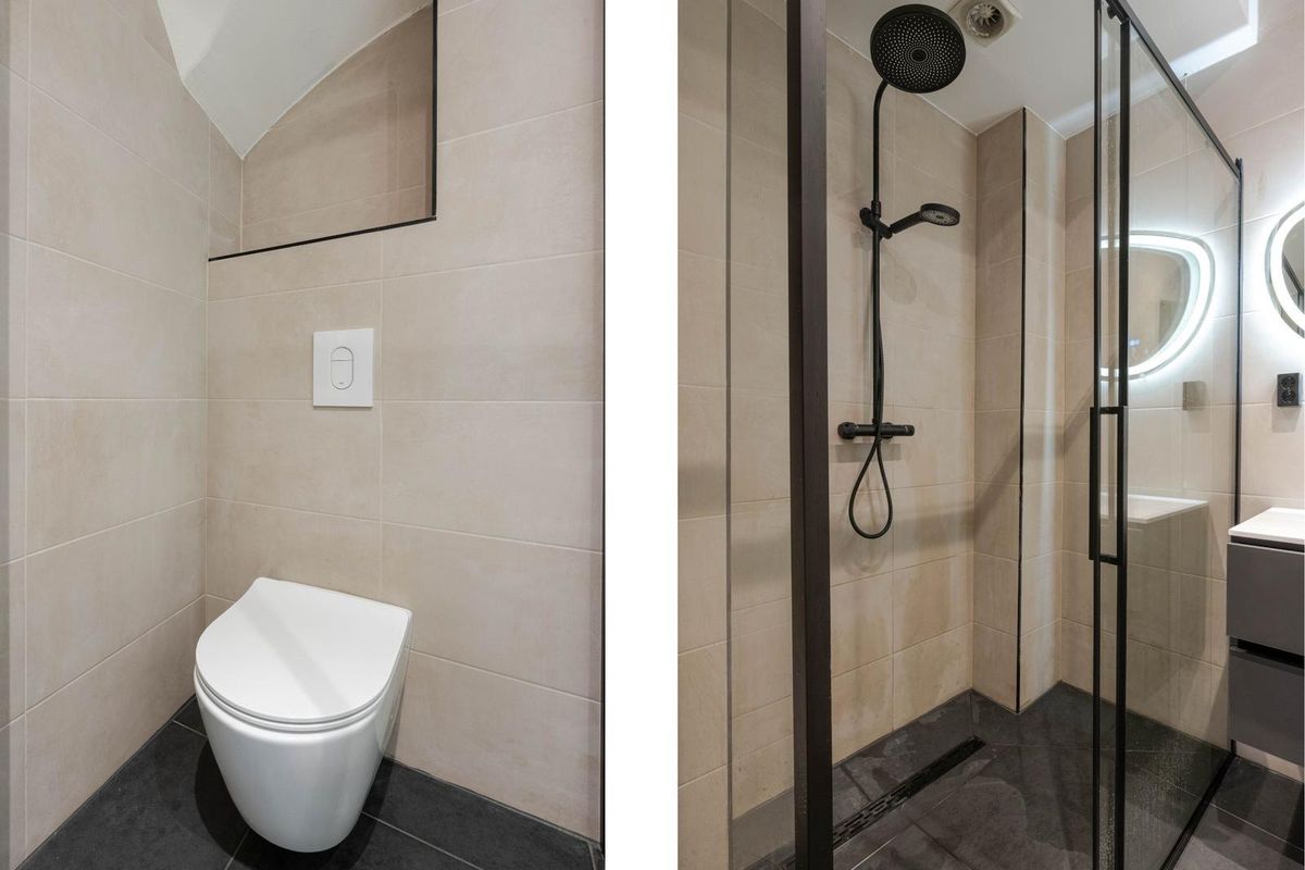* Luxe badkamer voorzien van moderne betegeling, douchecabine, wandcloset en verlaagd plafond met spotjes.