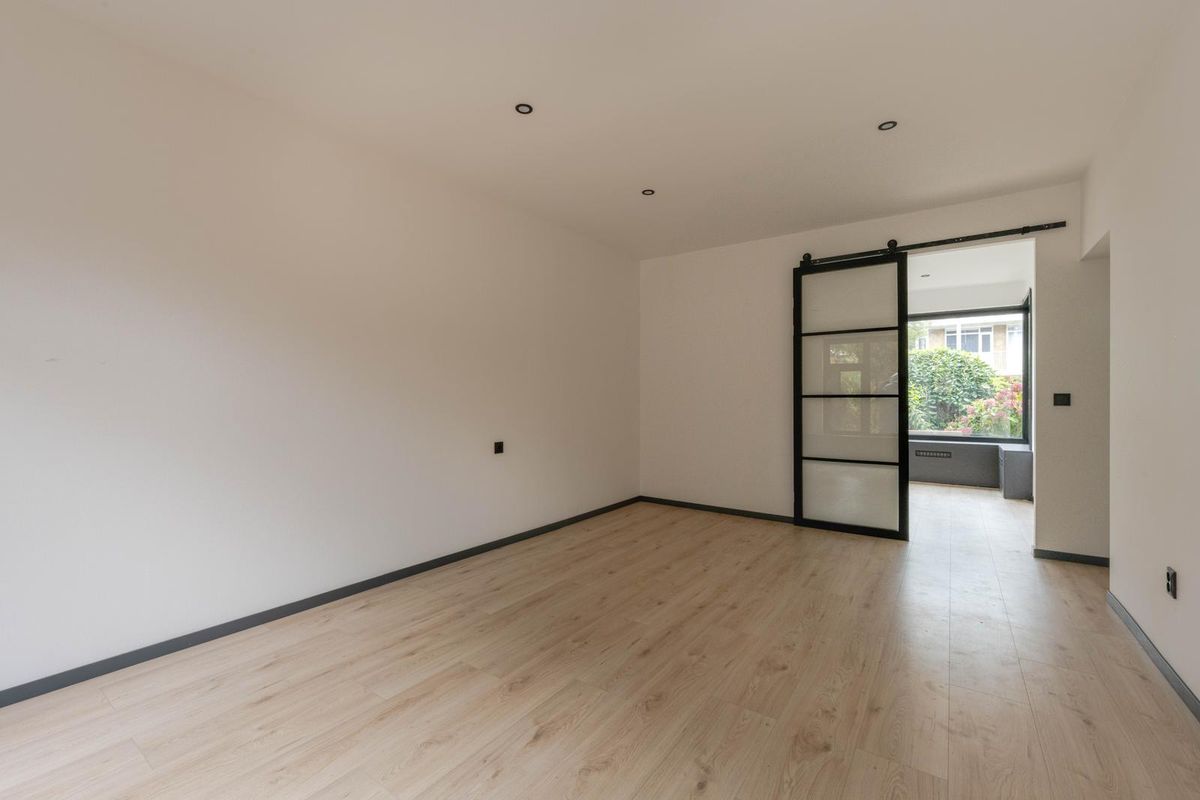* Tuingerichte woonkamer voorzien van laminaatvloer, verlaagd plafond met spotjes en een open verbinding met de keuken.