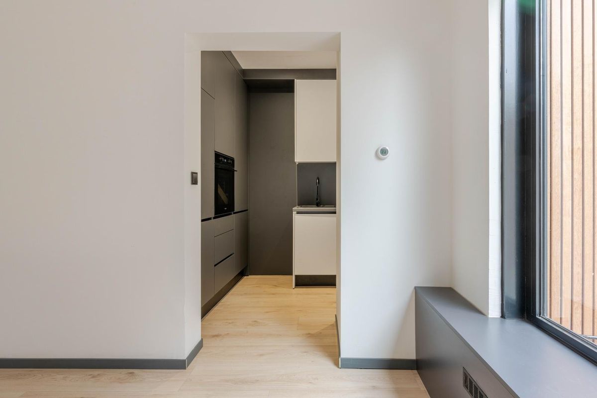 * Slaapkamer aan de voorzijde voorzien van een laminaatvloer, verlaagd plafond met spotjes en stijlvolle radiatorbekleding.