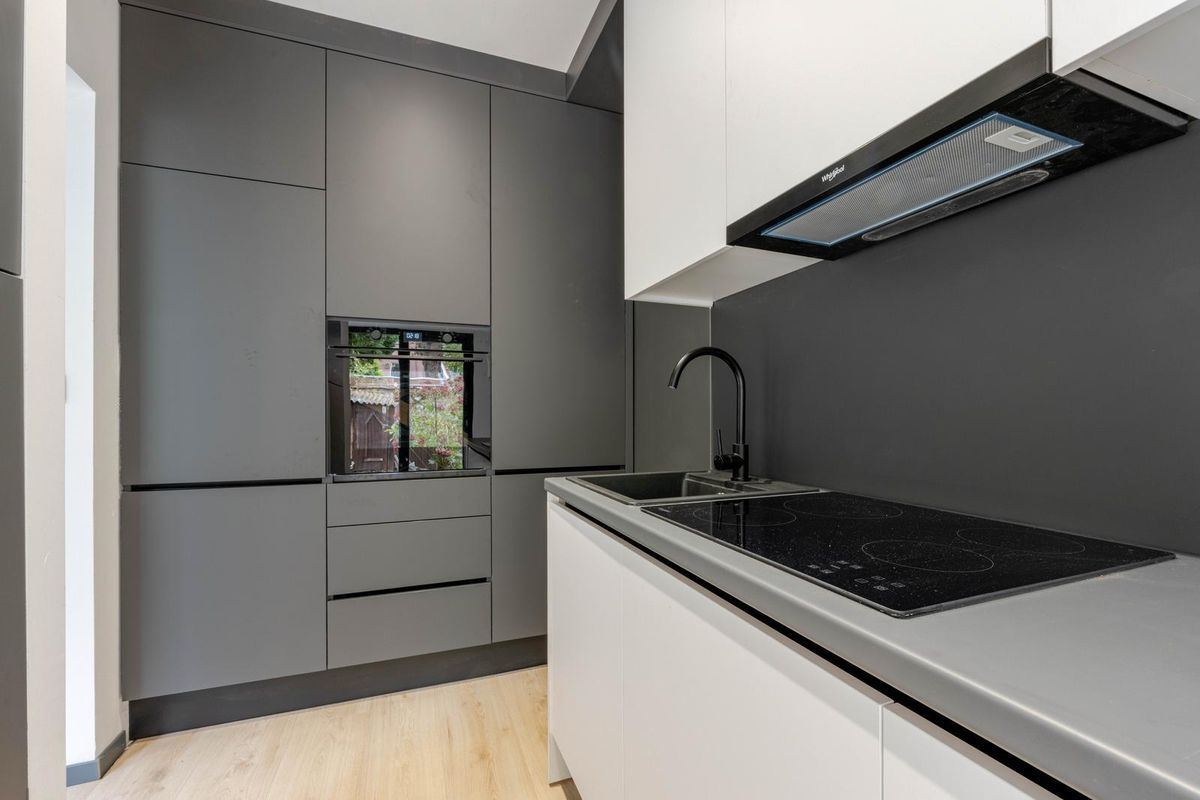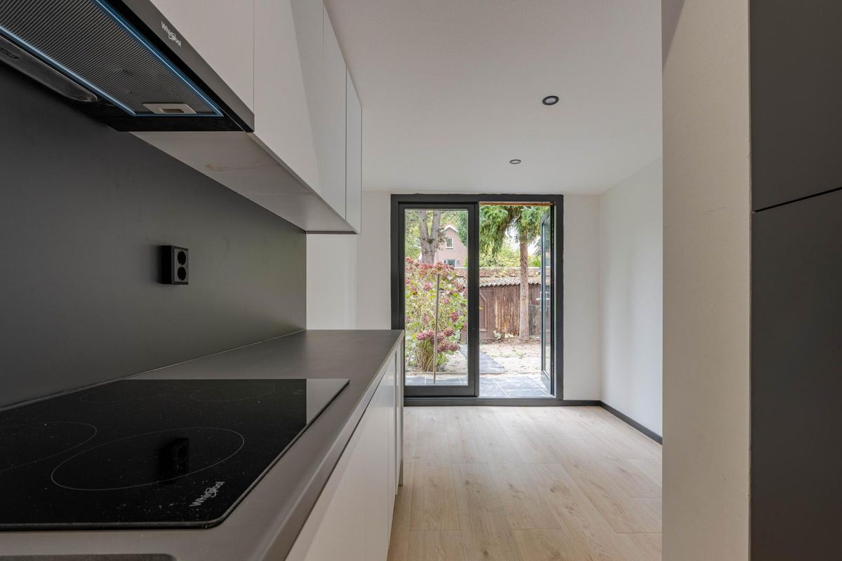 * Keukenruimte voorzien van luxe inbouwkeuken op gesteld in twee delen met apparatuur (Whirlpool): inductie kookplaat, vlakscherm afzuigkap, oven, koelkast, vrieskast en vaatwasser. De keuken biedt toegang tot de tuin en is deels gerealiseerd in de aanbouw, die ook aan de buitenzijde stijlvol is afgewerkt.