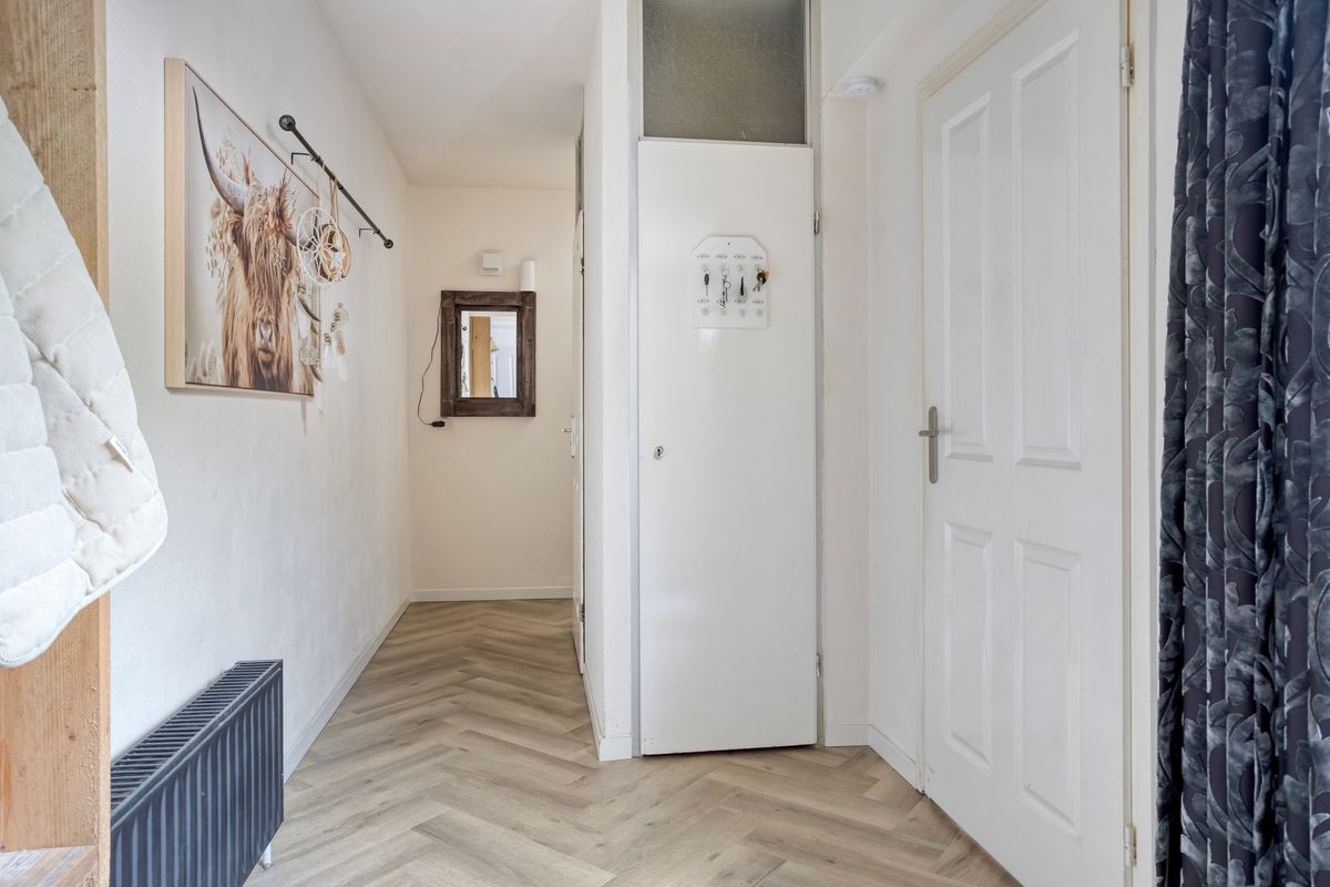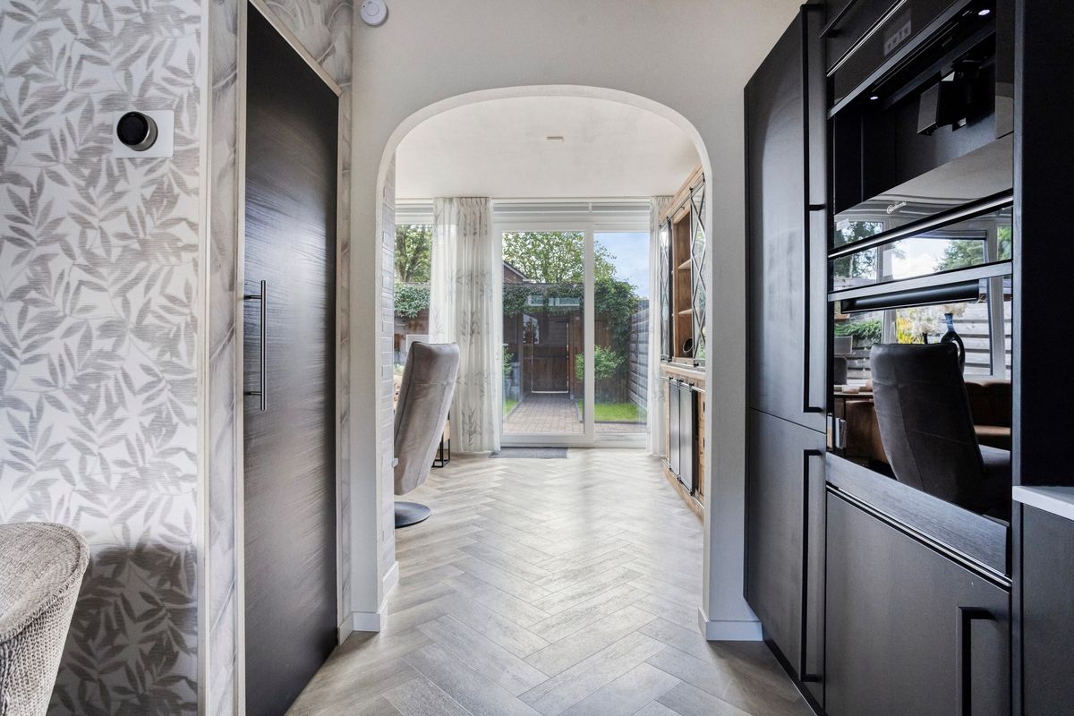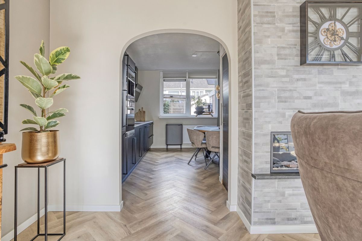 Zijentree, hal met garderobe en meterkast, tot kantoor/study ruimte omgebouwde bijkeuken, toilet, U-vormige woonkamer met eetgedeelte en zitgedeelte met mooie sfeerhaard en airconditioning, de grote schuifpui naar de tuin zorgt voor veel lichtinval, modern keukenblok ( 2022!) met diverse inbouwapparatuur. Alles in moderne kleurstelling!