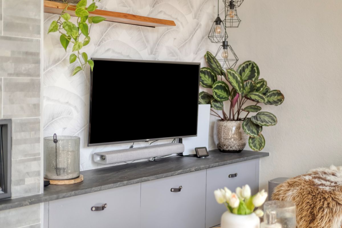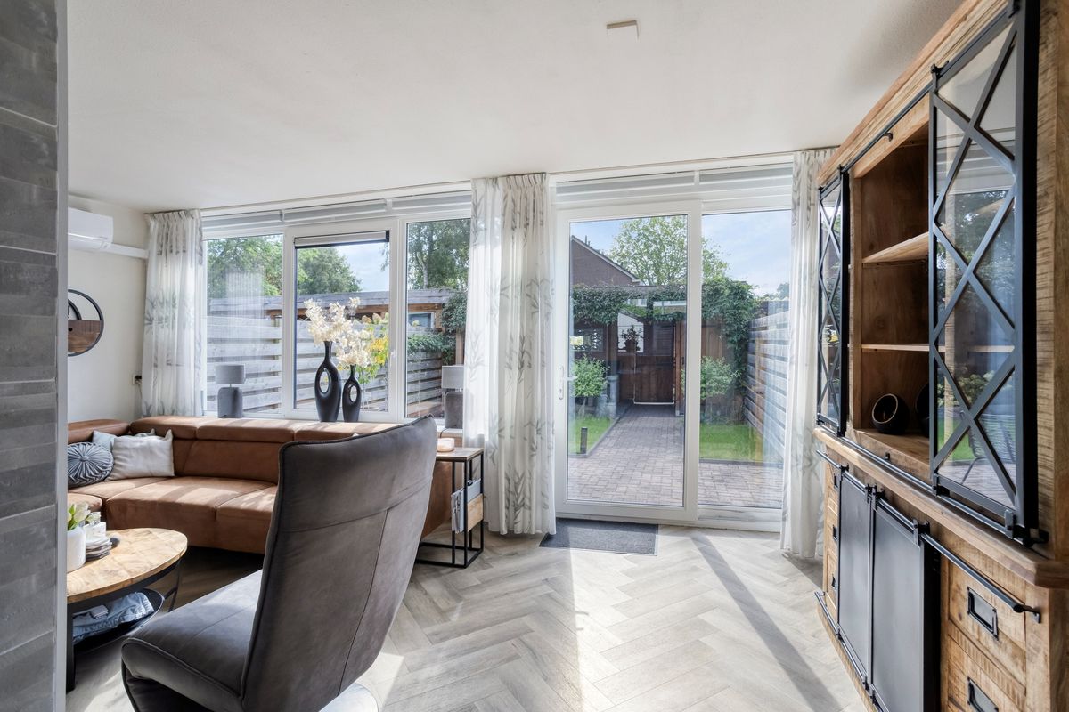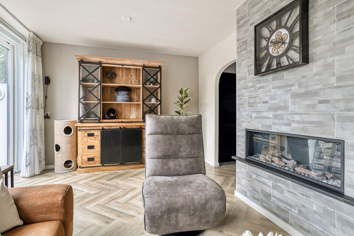 In de wookamer zorgt de stijlvolle elektrische haard voor extra warmte en sfeer. De woonkamer biedt lekker veel lichtinval en ruimte, en dankzij de grote schuifpui loop je zo door naar de zonnige tuin.