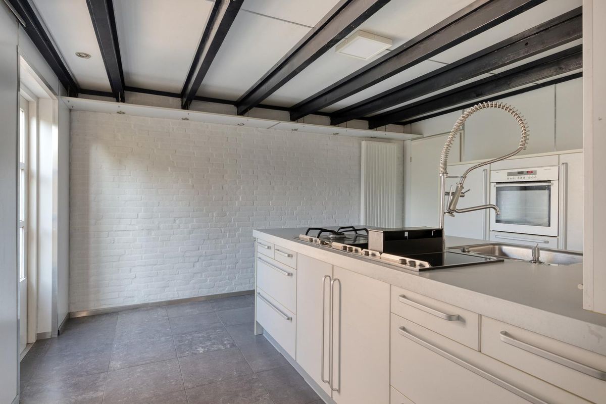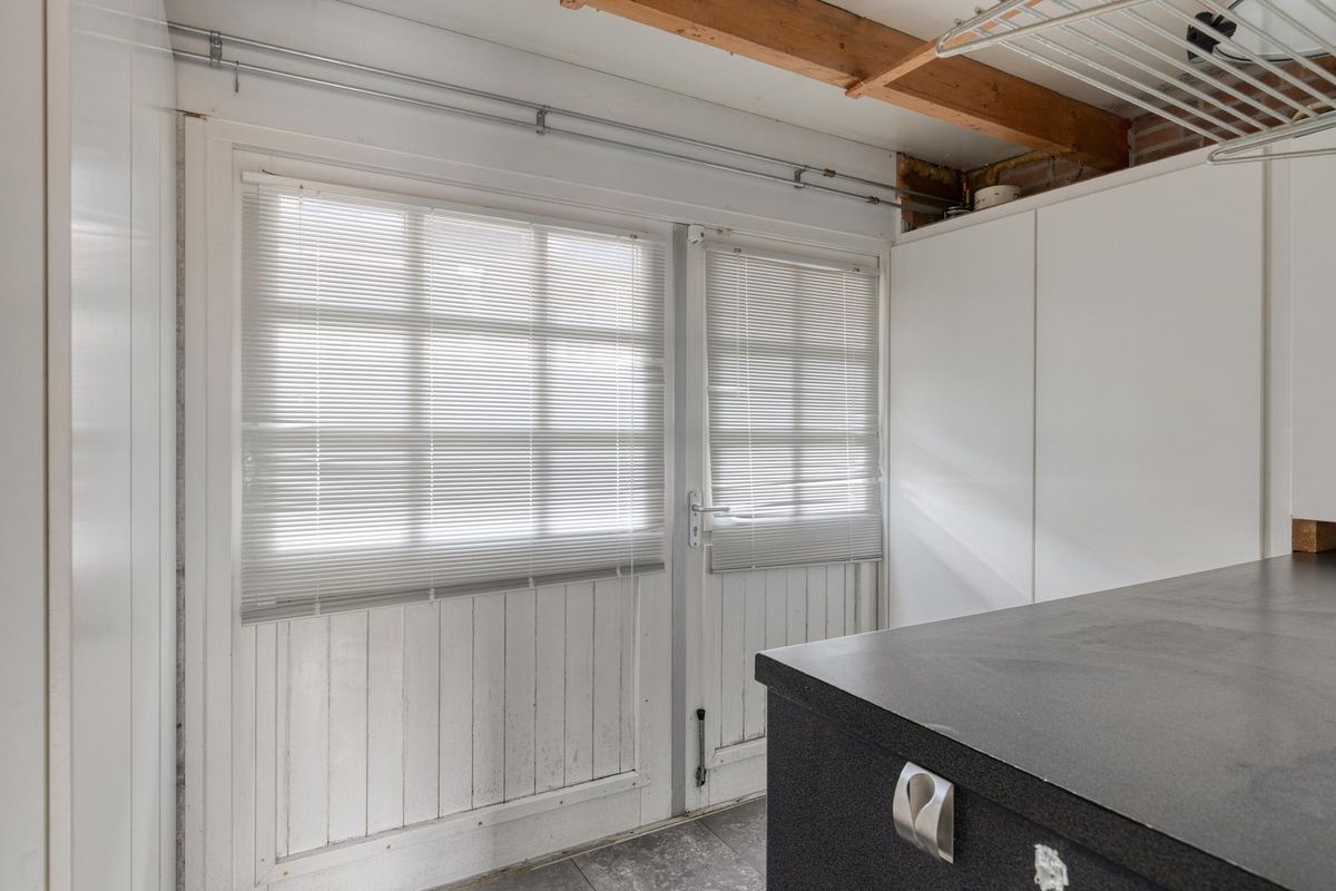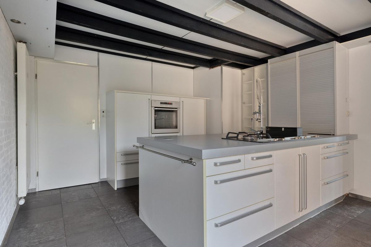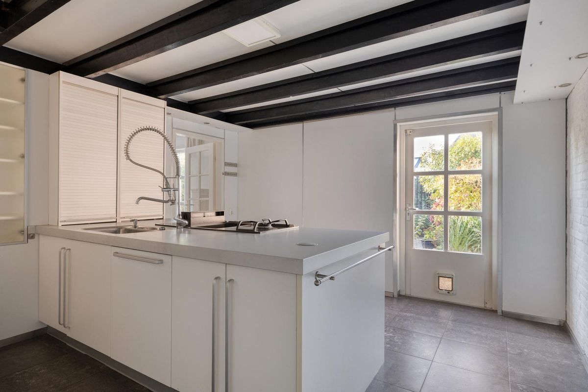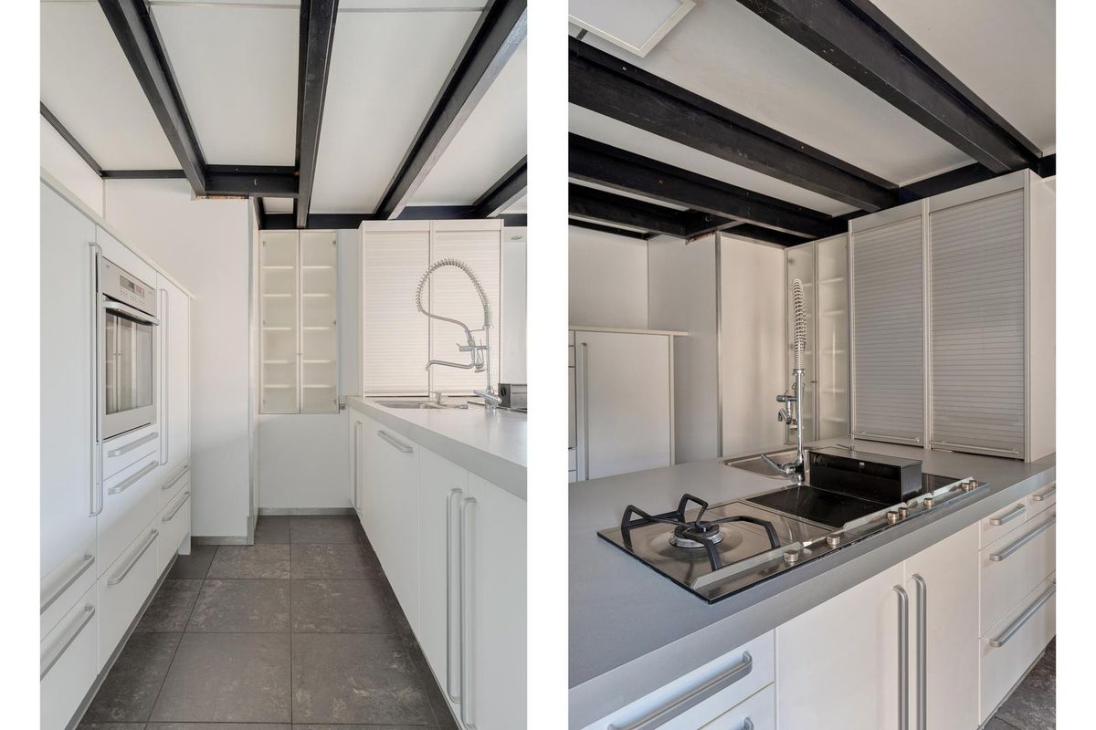 De afgesloten moderne keuken is praktisch ingedeeld in een rechte opstelling met een fraai kookeiland en biedt eveneens toegang tot de tuin. Aangrenzend vind je de voormalige berging, nu ingericht als een praktische bijkeuken – ideaal voor extra opslag of als wasruimte.