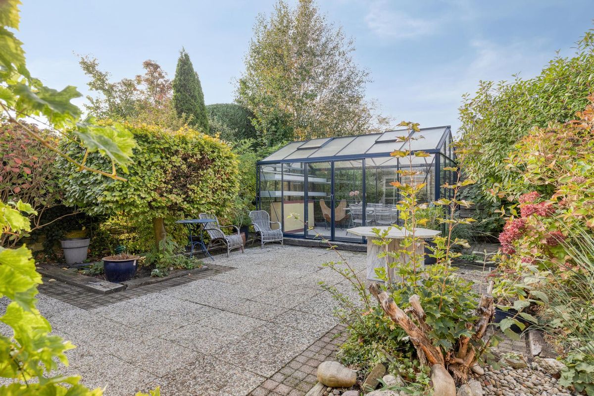De zonnige achtertuin, gelegen op het zuidwesten, is grotendeels bestraat met veel vaste beplanting voor sfeer en privacy. De echte eyecatcher is de glazen kas/overkapping met openslaande ramen en deuren – een perfecte plek om te ontspannen, borrelen of dineren, in elk seizoen.