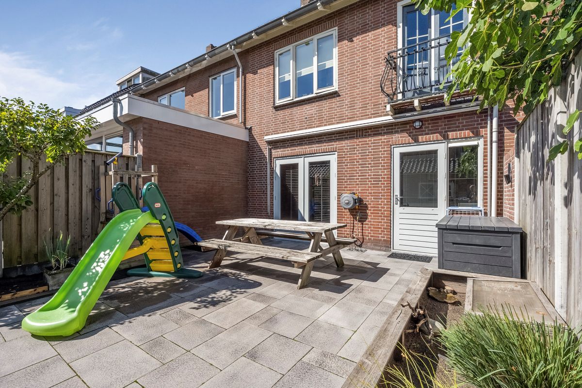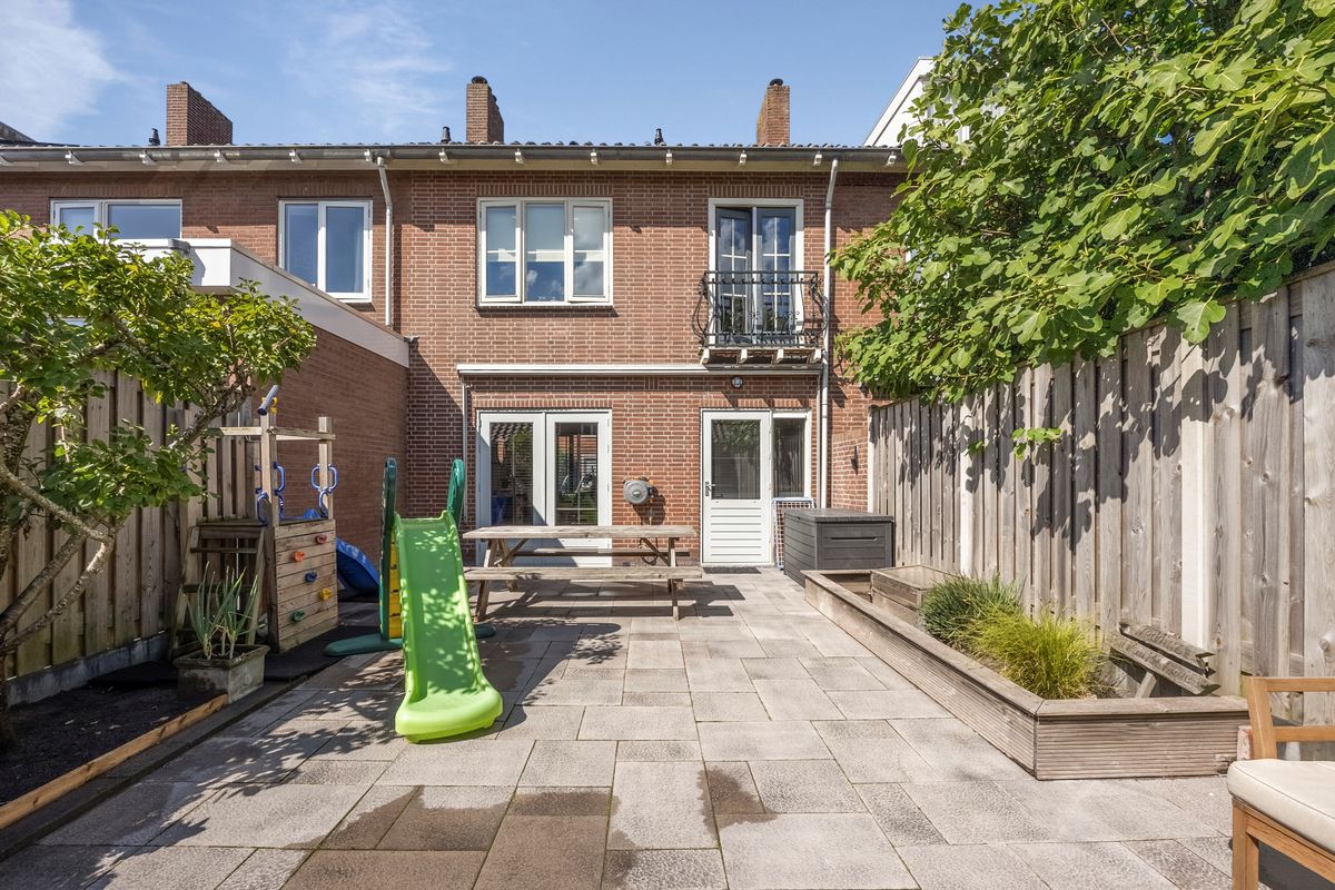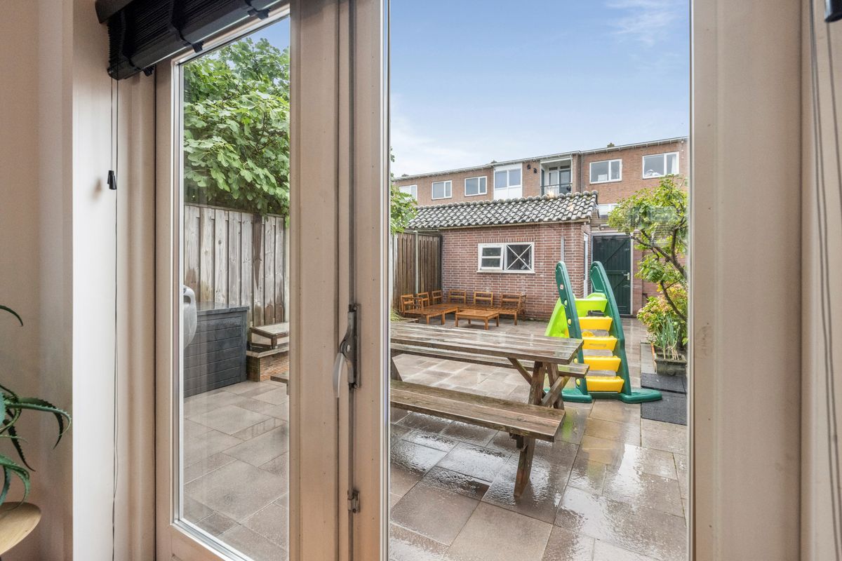 Via zowel de keuken als de tuindeuren stap je in de gunstig gelegen en prettig beschutte achtertuin. Deze is verzorgd aangelegd en wordt aangevuld met een robuuste schuur mét elektra. Achterom bereikbaarheid is er ook, handig bijvoorbeeld voor als je een motor hebt.
