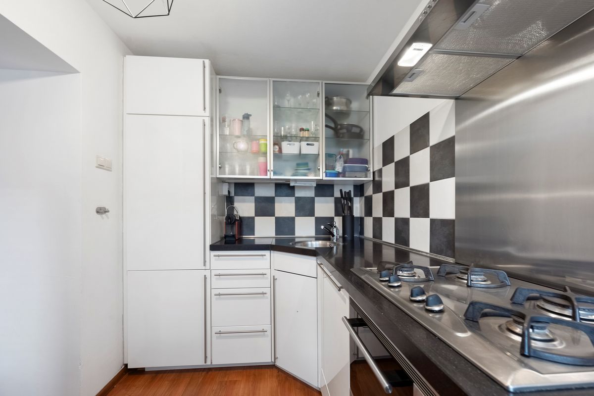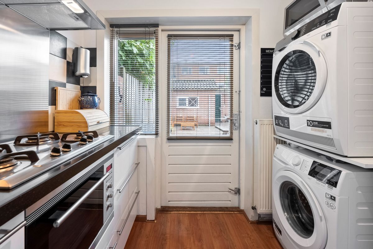 • De keuken voorzien van diverse inbouwapparatuur, waaronder een gaskookplaat, afzuigkap, vaatwasser, combi-oven-magnetron, koelkast en vriezer.