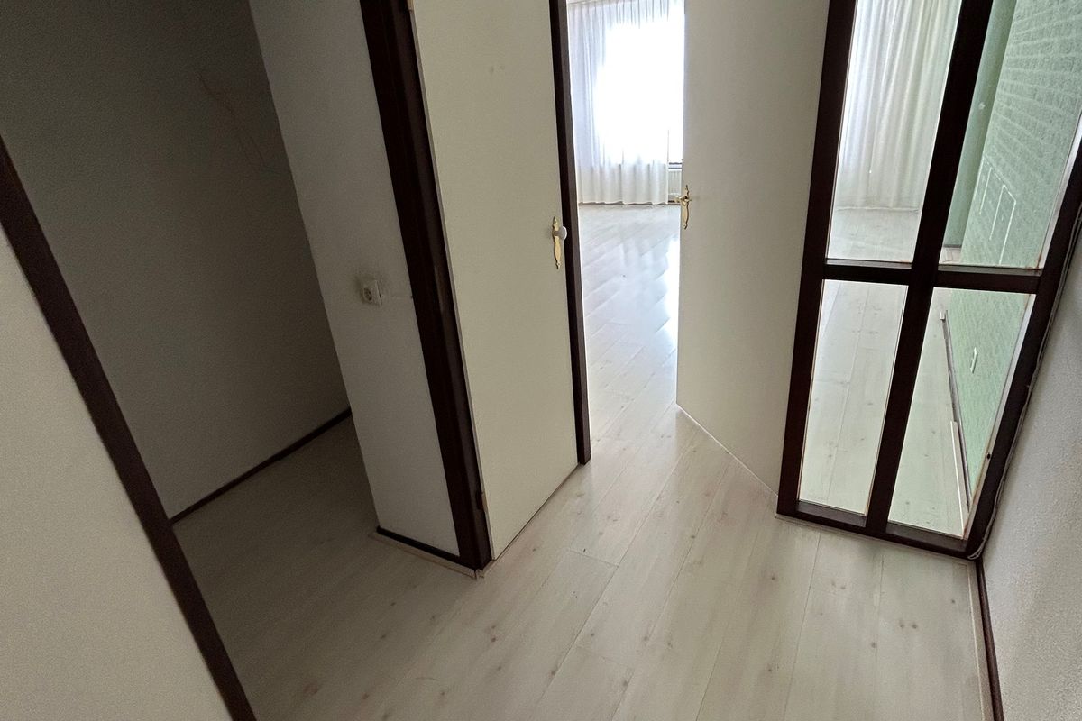 Portaal 1,60 x 0,90 met vloerbedekking, bergkast, deur naar toilet, badkamer en slaapkamer.