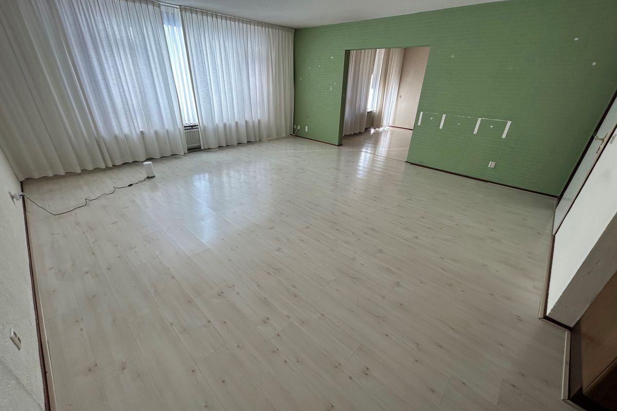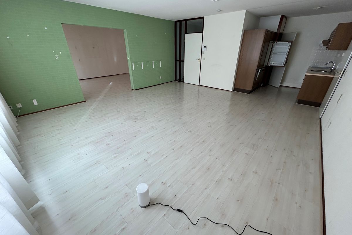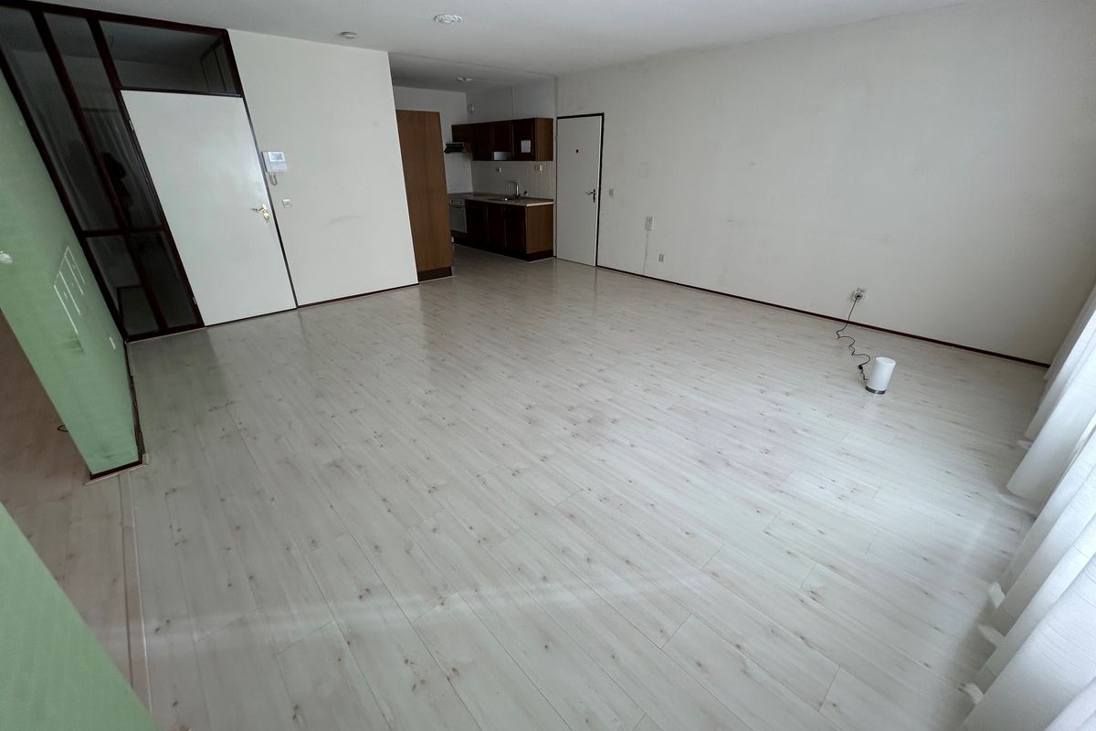 Woonkamer 6,20 x 5,50 met laminaatvloer, open keuken, doorgang naar slaapkamer en deur naar portaal.