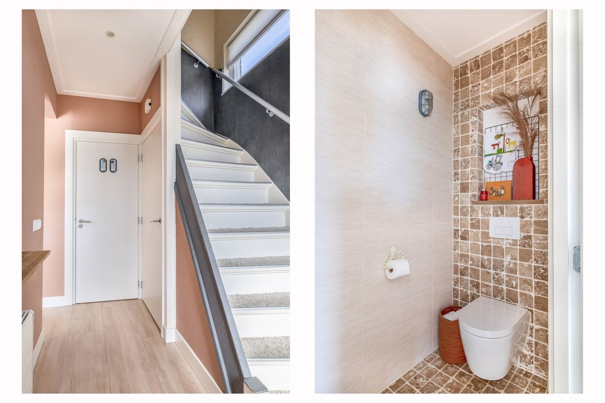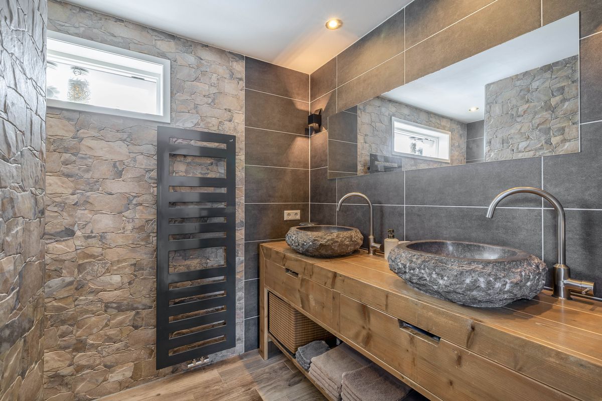 Overloop met een geheel betegeld, separaat tweede toilet. De prachtige badkamer is volledig gerenoveerd en afgewerkt met een combinatie van grijze wandtegels en tegels met een natuursteenlook. Er is een breed houten meubel geplaatst met daarop twee waskommen en twee laden voor het opbergen van spullen. De brede spiegel en designradiator maken het geheel compleet.