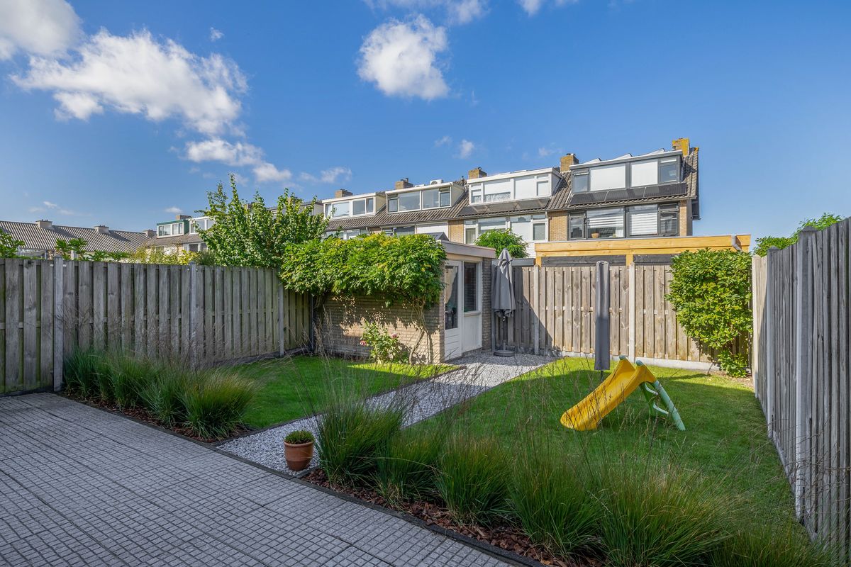 Omdat het een hoekwoning betreft, is de tuin extra breed en was er ruimte om een extra berging aan de zijkant van het huis te bouwen. Ideaal als klusruimte of voor de bakfiets. Achter in de tuin staat nog een stenen berging. De tuin is kindvriendelijk aangelegd met een grote grasmat, kleine borders en vaste planten tegen de schutting en berging. Voor de woning is een terras aangelegd en het grote zonnescherm zorgt op warme dagen voor extra schaduw. Op de verdieping zijn de slaapkamers voorzien van rolluiken.