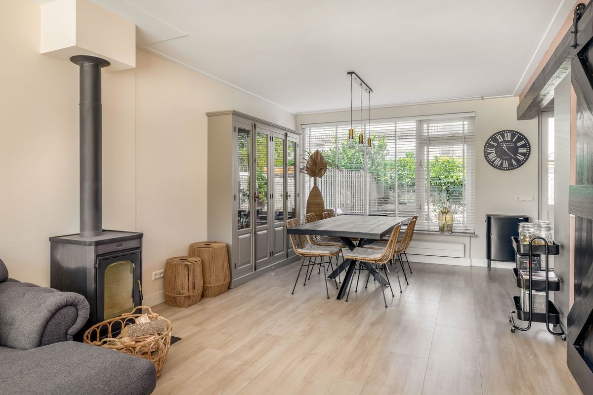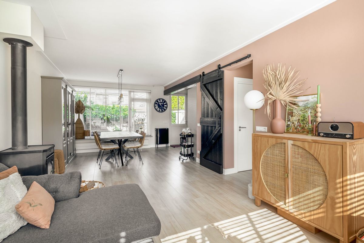 De doorzonwoonkamer is licht en ruim, afgewerkt met glad gestuukte wanden en plafonds, en van de hal gescheiden door een zwarte houten schuifdeur. De gezellige houtkachel zorgt voor warmte en sfeer, maar ook voor een lage gasrekening. Dankzij de doorzonindeling is er volop daglicht. De laminaatvloer loopt vanuit de hal door naar de woonkamer en keuken.