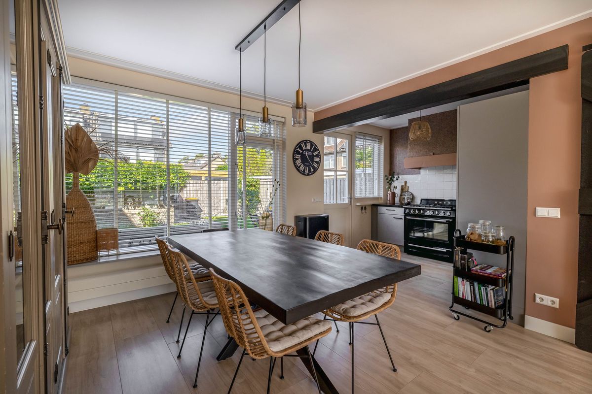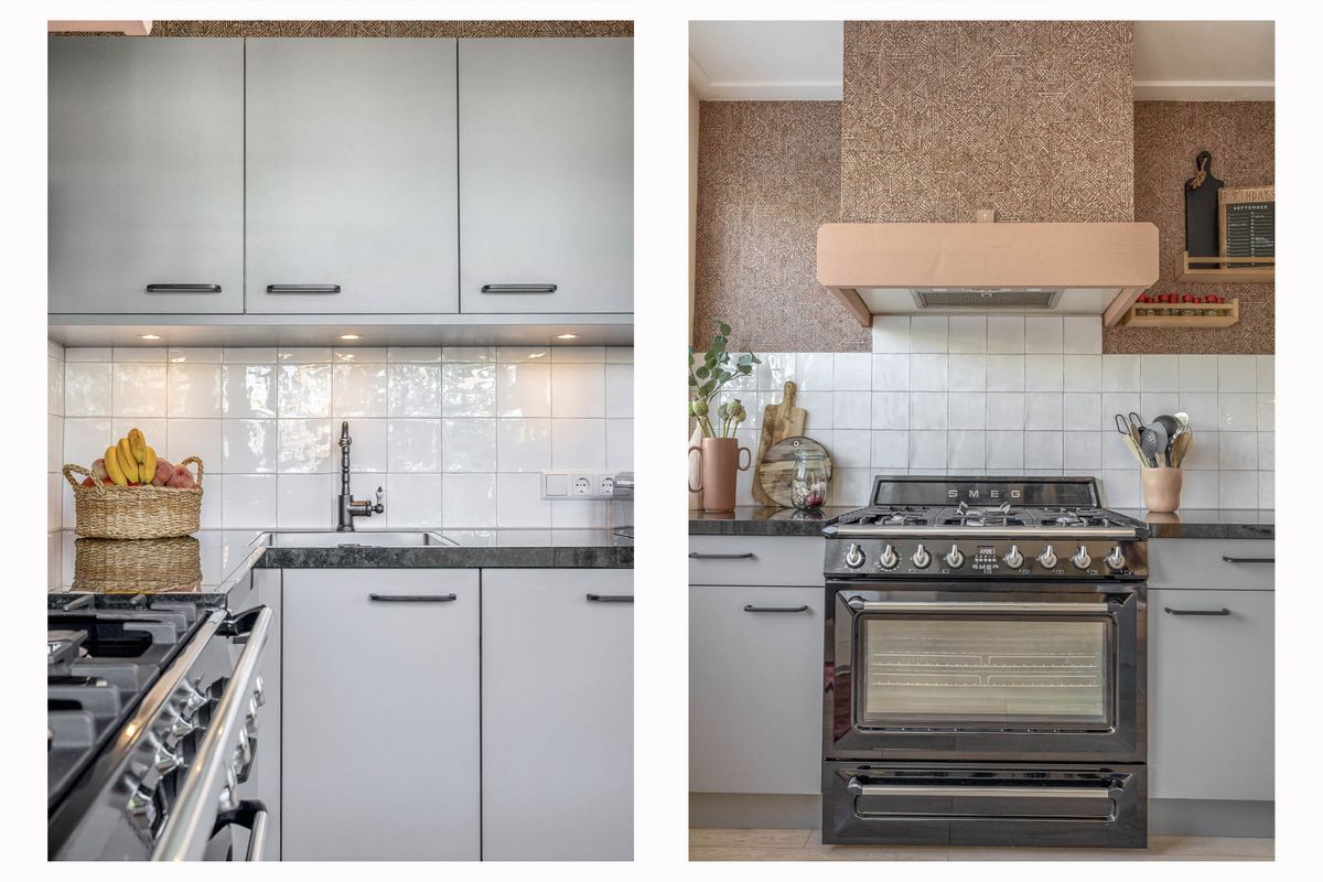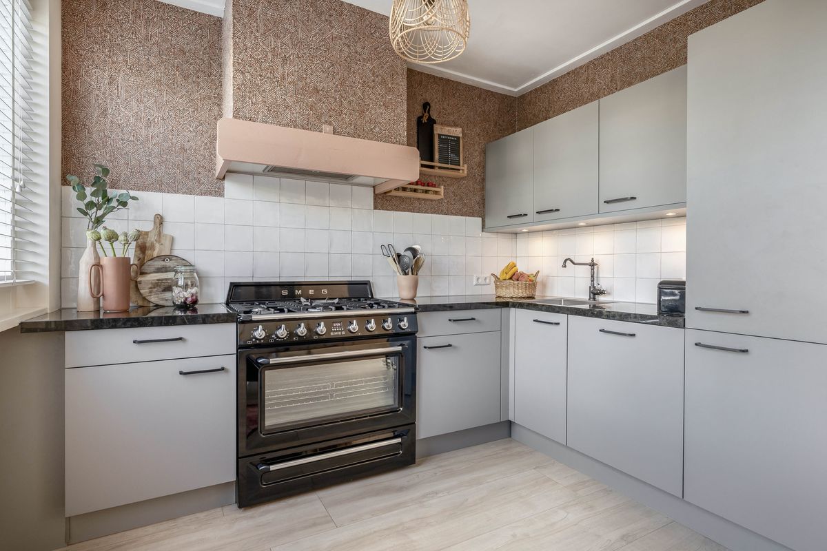 De keuken in L-opstelling is uitgevoerd met lichtgrijze kastfronten en een donker stenen werkblad. Deze beschikt over een fraai zwart fornuis, afzuigschouw, vaatwasser, koelkast en bijpassende kranen en grepen. Vanuit de keuken is er toegang tot de zonnige tuin op het westen.