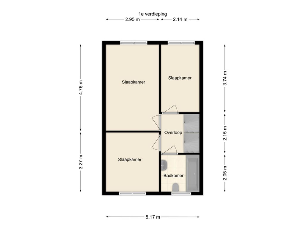 Op de eerste verdieping bevinden zich drie slaapkamers en een badkamer met ligbad, wastafelmeubel, toilet en te openen raam voor ventilatie.