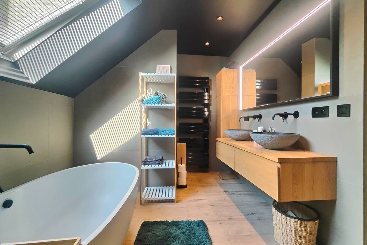De volledig gerenoveerde badkamer is een oase van comfort en stijl: voorzien van een vrijstaand ligbad, een inloopdouche met donker gerookt glas en rainshower, dubbele lavastenen wastafels op een eiken badkamerkast, en een Velux-raam dat de ruimte vult met natuurlijk licht. Een perfecte plek om te ontspannen en tot rust te komen.