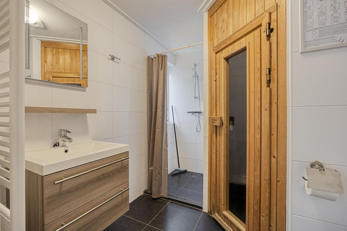 Bij binnenkomst betreedt u de hal met aan uw rechterhand de ruime badkamer, voorzien van inloopdouche, wastafel, toilet en sauna. De hal leidt verder naar de woonkamer, een royaal vertrek met twee grote banken, twee fauteuils, een gezellige houtkachel en openslaande deuren naar de tuin. Grenzend aan de woonkamer vindt u de eetkamer en de open keuken, uitgerust met inbouwapparatuur zoals combi-oven/magnetron, vaatwasser, gasfornuis, afzuigkap en koelkast.