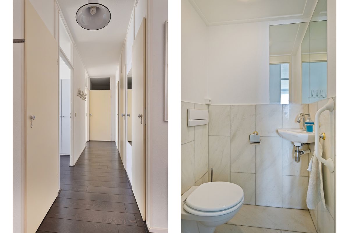 Het appartement beschikt over twee ruime slaapkamers, beide voorzien van praktische inbouwkasten. De badkamer is verzorgd en functioneel. Daarnaast is er een apart toiletruimte en een wasruimte/berging met aansluitingen voor witgoed apparatuur.